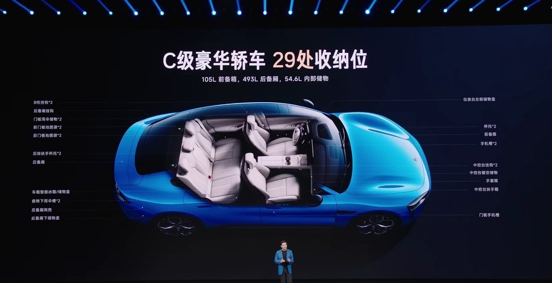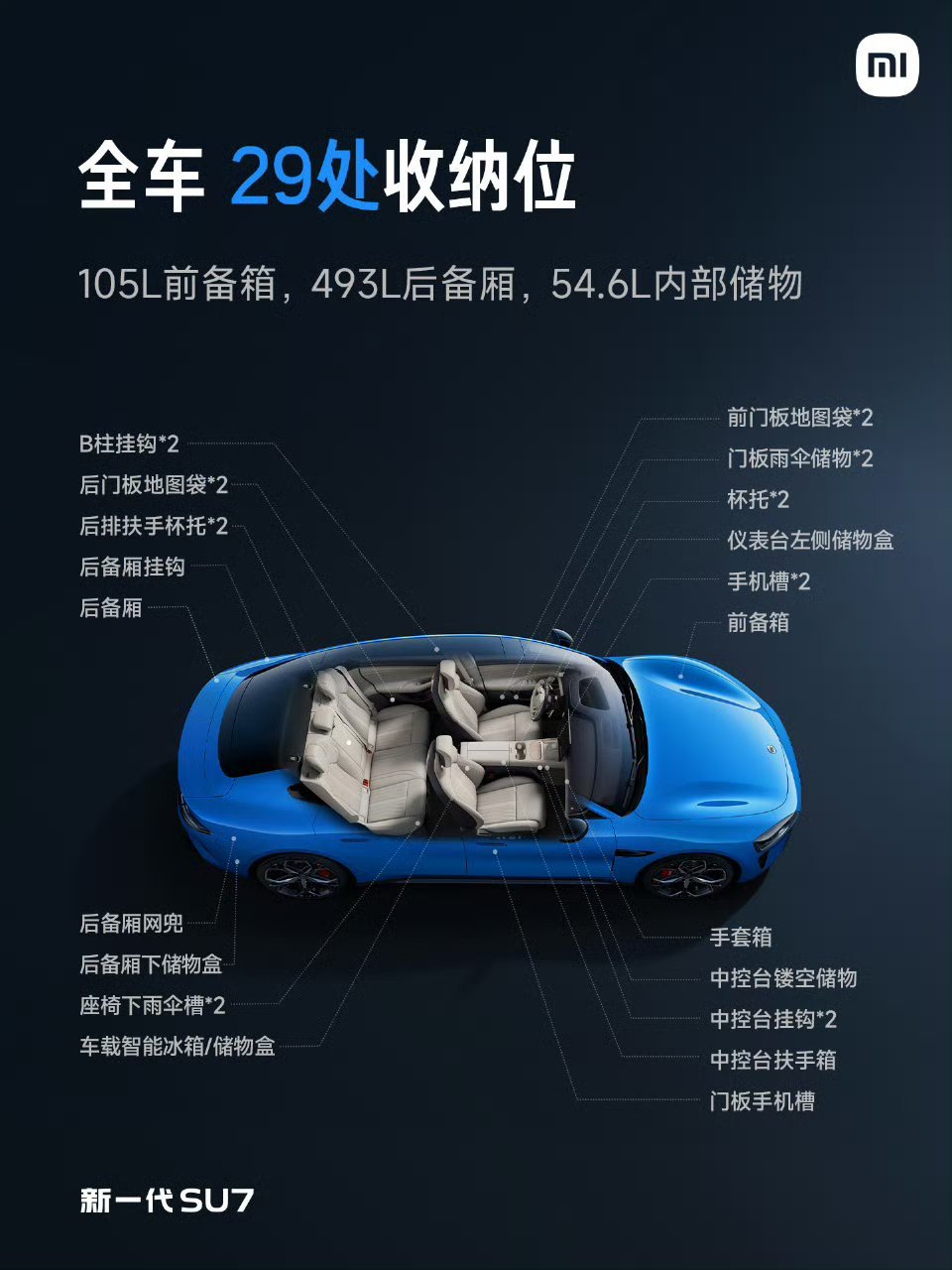 ① 三层环绕式氛围灯,豪华氛围升级;② 高频接触内饰面100% 软包覆,简洁不失豪华;③ 四款内饰颜色,款款惊艳;④ 音响系统升级,Max版标配 25扬声器豪华音响系统。⑤ 全车29处收纳位,满足多样储物需求;小米发布会 小米新一代su7今日发布 新一代su7