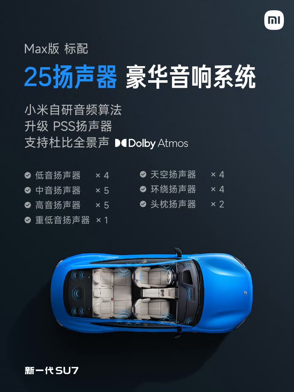 新一代小米 SU7 标准版、Pro 版升级 14 扬声器,Max 版标配 25 扬声器,
