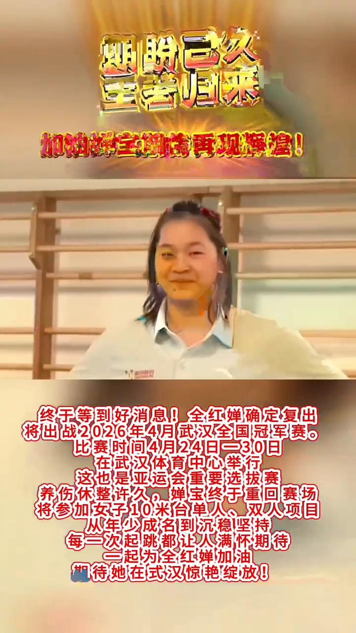 期盼已久,王者归来,加油蝉宝,期待再现辉煌。 终于等到好消息,全红婵确定复出,将出战2026年4月武汉全国冠军赛。比赛时间4月24日-30日,在武汉体育中心举行,这也是亚运会重要选拔赛。养伤休整许久,婵宝终于重回赛场,将参加女子10米台单人、双人项目。从年少成名到沉稳坚持,每一次起跳都让人满怀期待。 一起为全红婵加油,期待她在式汉惊艳绽放。