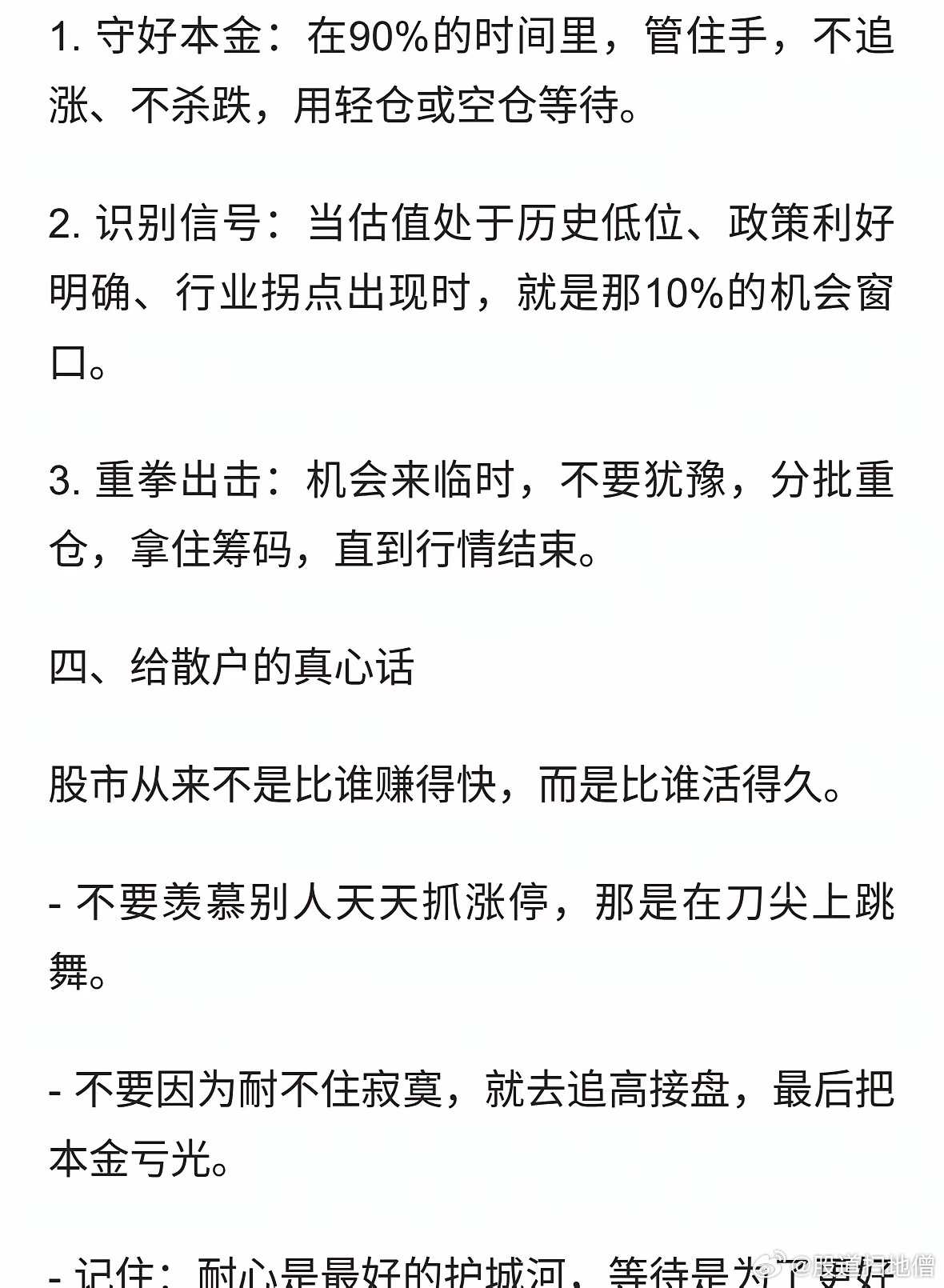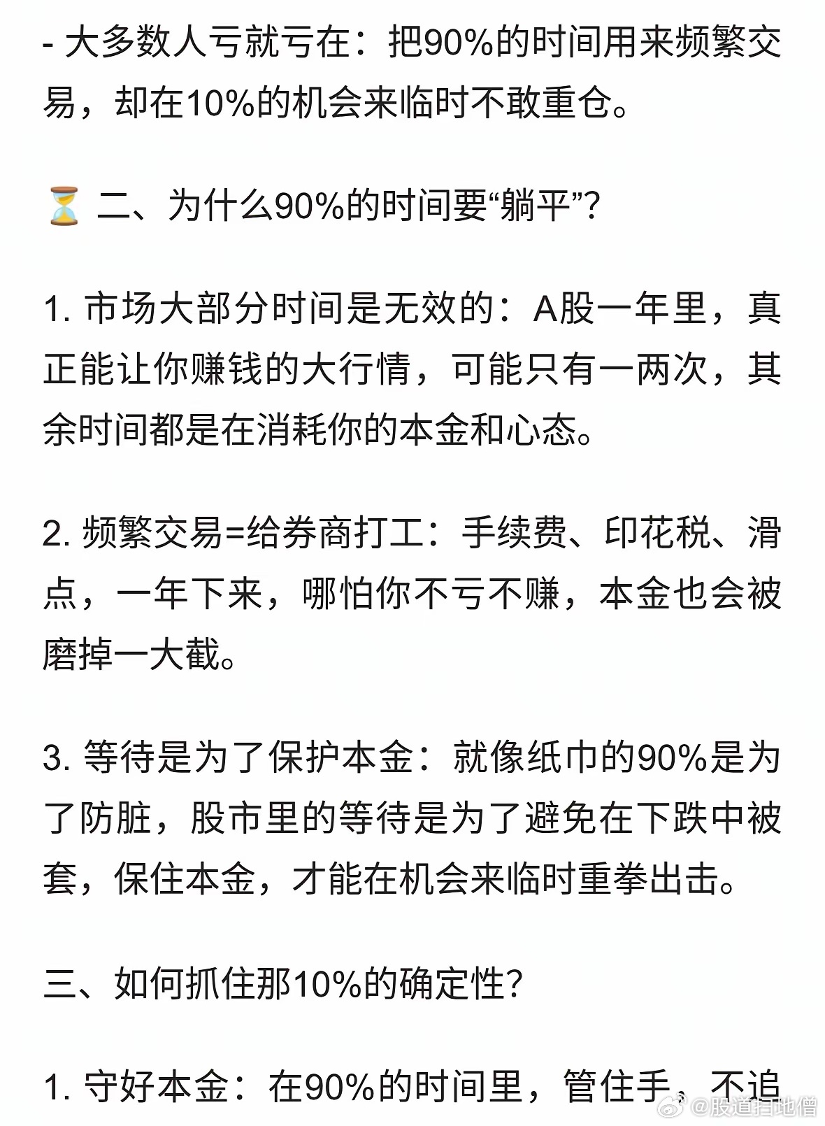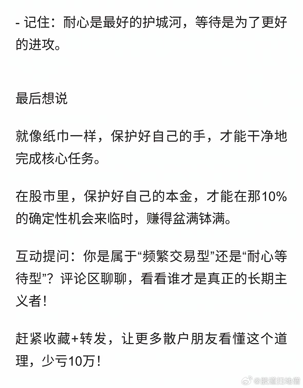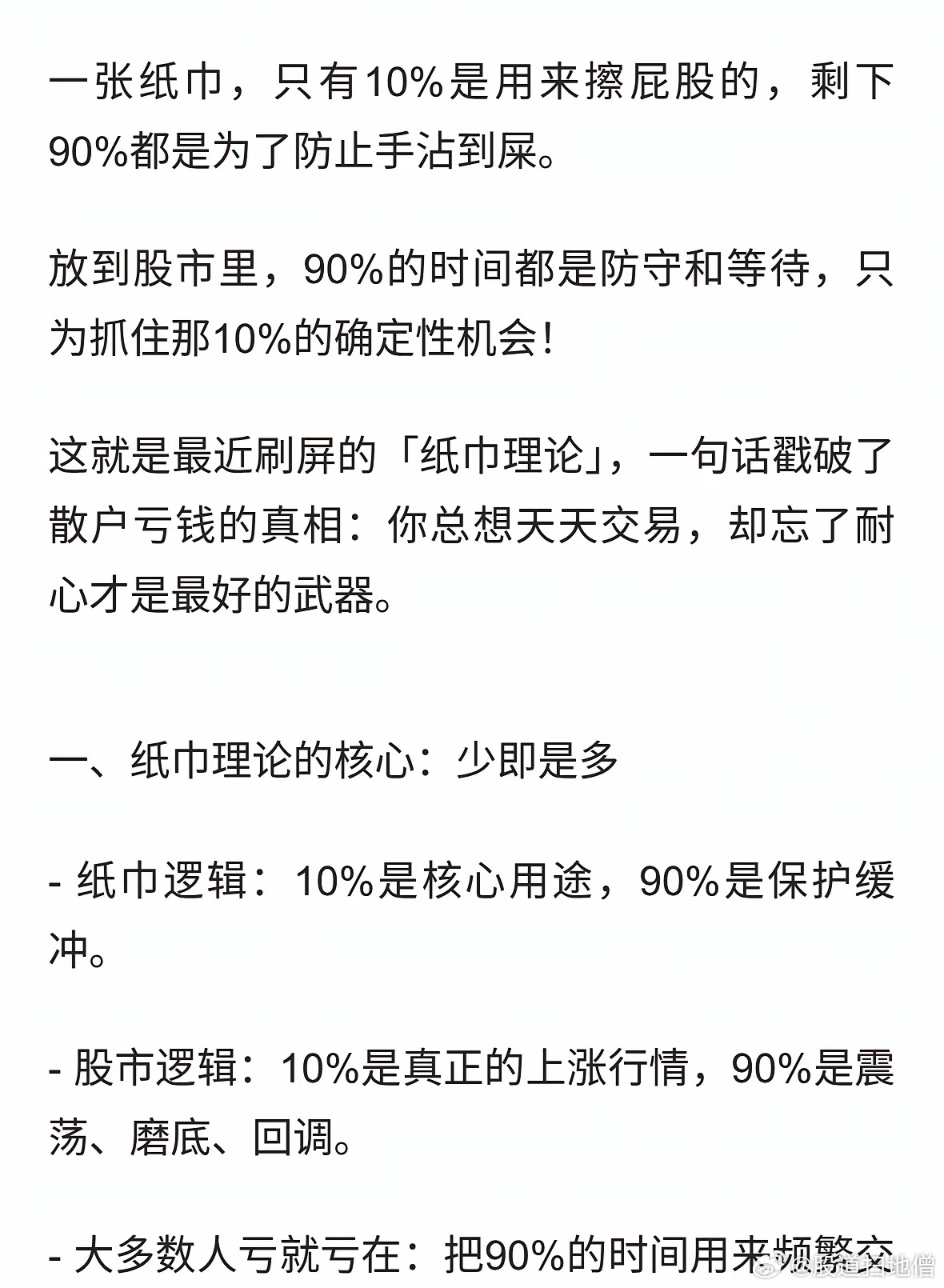 股市里的纸巾理论:一张纸巾,只有10%的面积是真的用来擦屁屁的剩下90%的面积,是为了防止手沾到屎。同样,在股市中90%的时间是用来防守和等待的,等待那10%的确定性。
