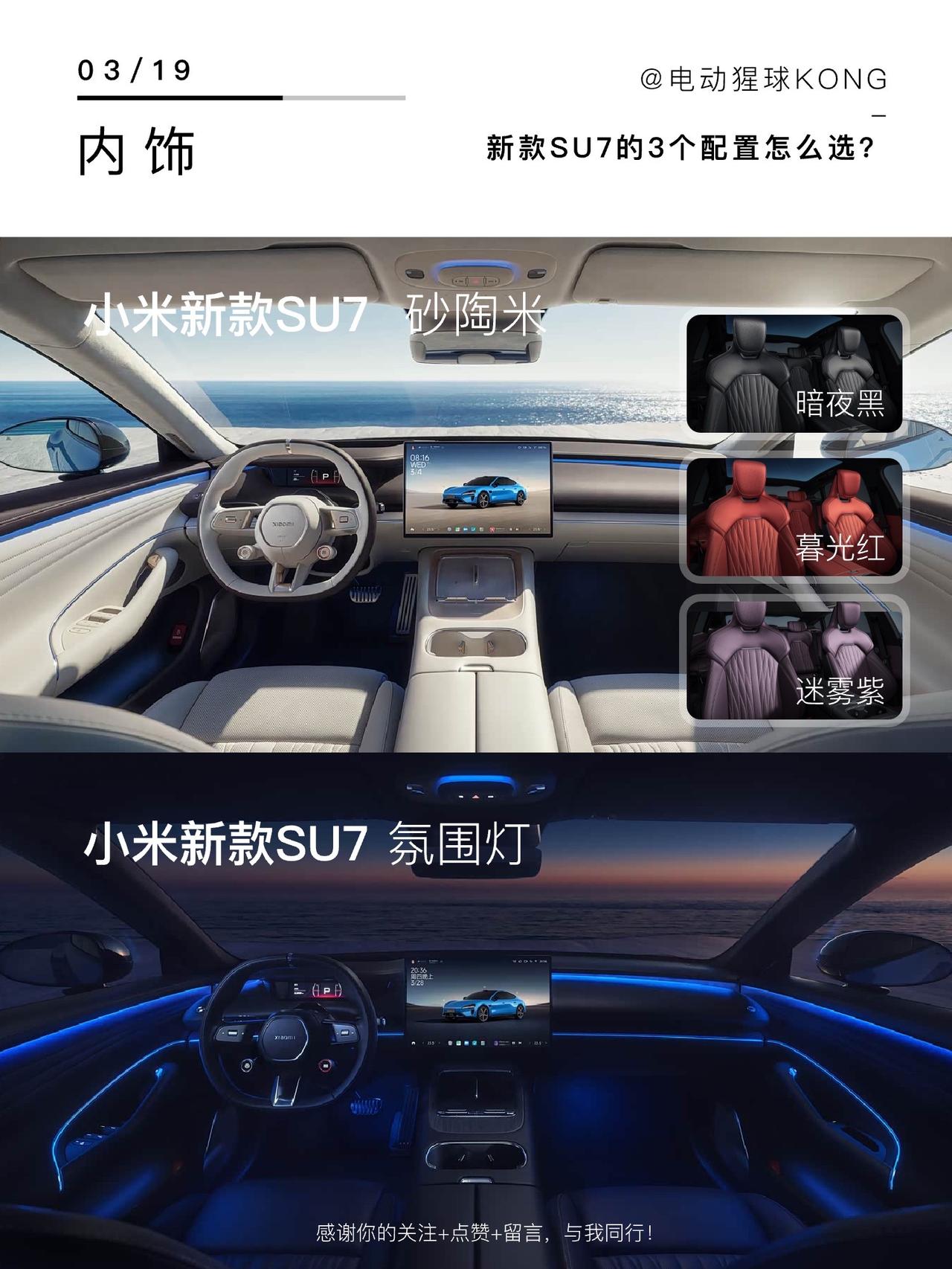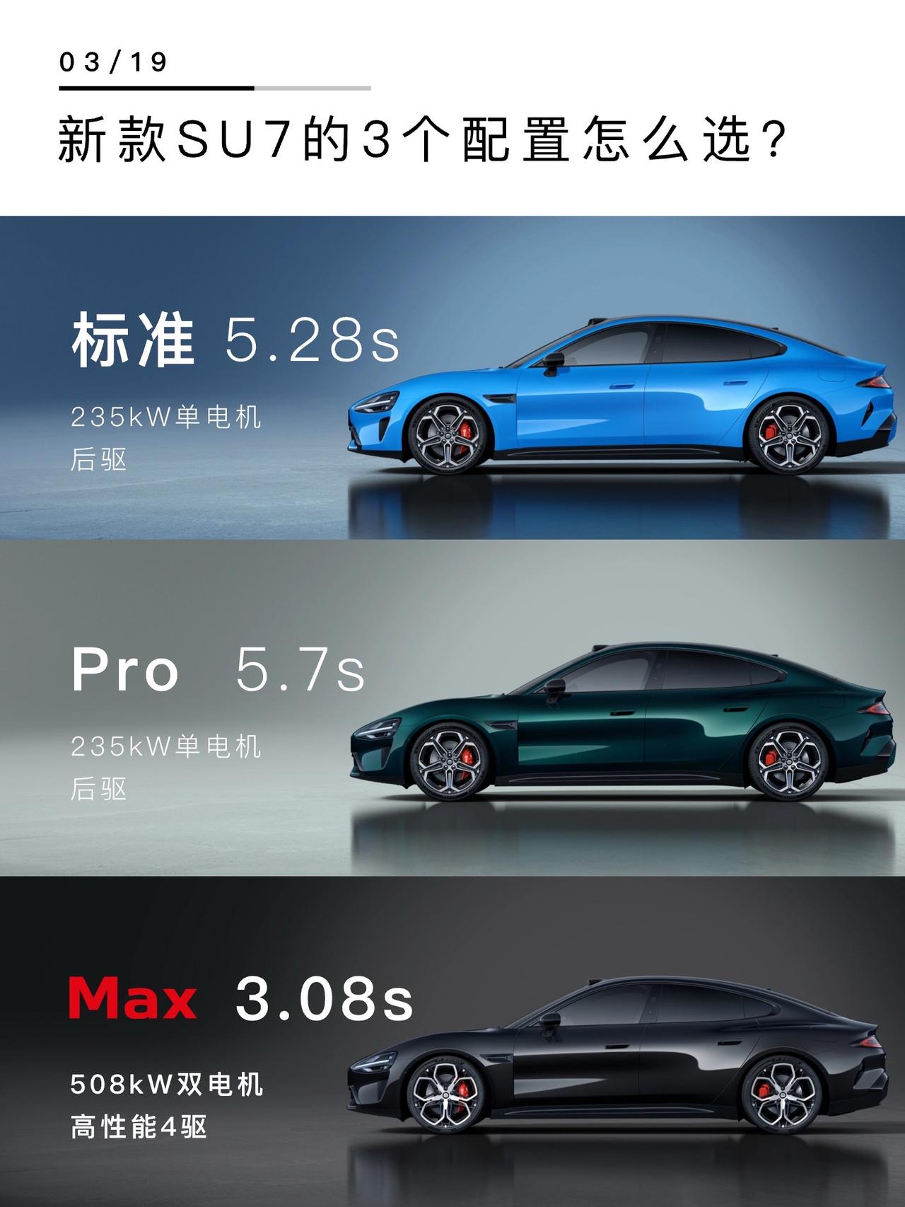 新款小米SU7正式发布,价格微微上调,3款配置怎么选? 1️⃣标准版 激光雷达终于标配了,充电更快,女生推荐,日常通勤接送小孩足够 2️⃣Pro版 续航902km,支持快充,有空悬和CDC,家庭用户推荐,续航长家人舒适 3️⃣Max版 21寸的新梅花轮毂太帅了,新增分区调光天幕,支持超快充,加速3秒级,适合性能车爱好者,一步到位 最后,你觉得哪个配置合适?小米su7 小米