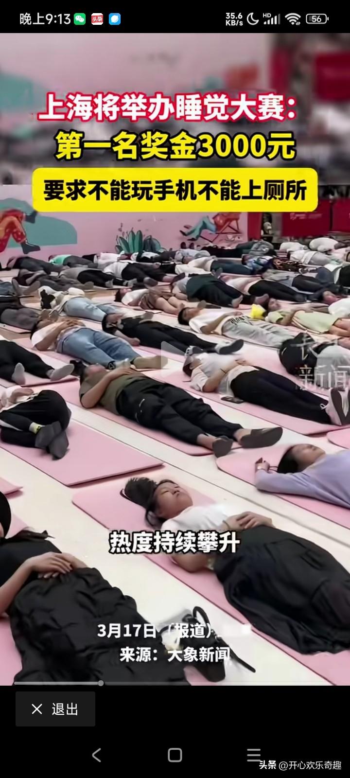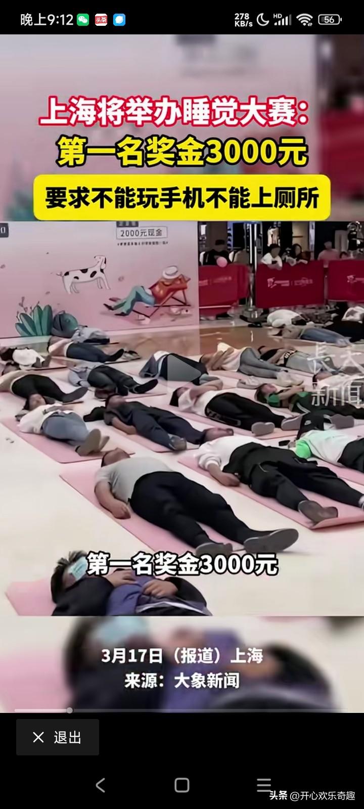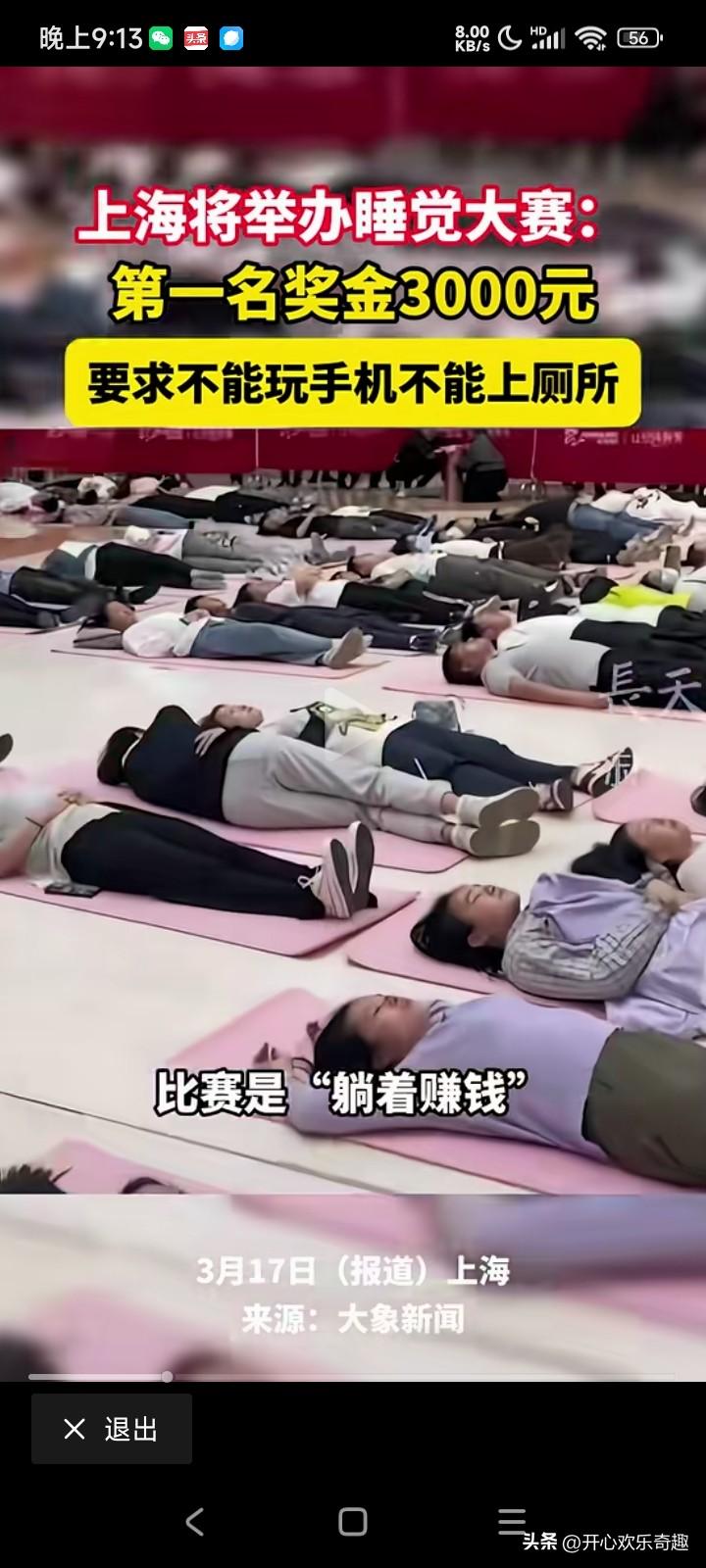 赚钱好方法,大上海即将要举办一个睡觉大赛。第一名的奖金竟然有3000大元呢。 他只有一个很小的要求,就是在比赛的期间不能看手机,也不能上厕所,你可以在那个地上躺着,闭目养神。也可以在地上发呆,但是不能离开那个毯子。 据主办方透露,3月21号的那个比赛的那个报名已经报满了,3月28号的那个比赛的报名也是正在持续的升温。 在现在这个离不开手机的时代,如果让大家有一段的时间不看手机,不玩手机,那可能大家还可以勉强做到吧。 只是如果一整天都不去厕所,不上厕所,而且那个人也不能动的话,那到底多少人可以做得到呢? 例如有的人出了一个鬼主意,就是说到时候去比赛的时候吃几颗安眠药,又或者到时候去比赛的时候喝两斤白酒才过去,去痘的时候咕噜咕噜的睡觉,那多好呀。只是说这些空的想法是不是没有什么实战意义了,因为如果喝了两瓶白酒下肚子的话,那么很快就要上厕所了,这样的策略也是走不通的,而且还有吃几个安眠药才去参加比赛的话,有可能就是药效刚刚起的时候睡个觉觉而已,那个药效过了之后也不是没有。什么效果? 这样的比赛首先需要考验自己的定力,首先要考虑一下自己到底能脱离手机多长的时间,第二考虑一下自己到时候会不会肚子打呼噜,而且也要考虑一下到时候自己要上多少次厕所了?