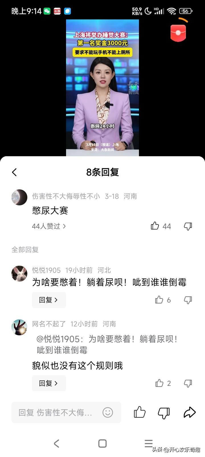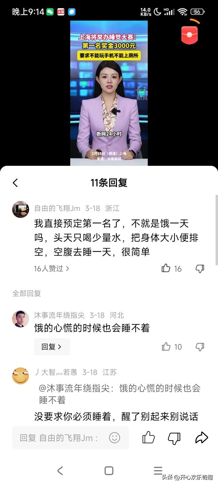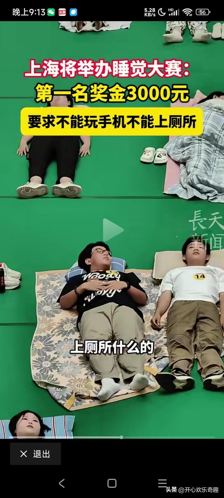 赚钱好方法,大上海即将要举办一个睡觉大赛。第一名的奖金竟然有3000大元呢。 他只有一个很小的要求,就是在比赛的期间不能看手机,也不能上厕所,你可以在那个地上躺着,闭目养神。也可以在地上发呆,但是不能离开那个毯子。 据主办方透露,3月21号的那个比赛的那个报名已经报满了,3月28号的那个比赛的报名也是正在持续的升温。 在现在这个离不开手机的时代,如果让大家有一段的时间不看手机,不玩手机,那可能大家还可以勉强做到吧。 只是如果一整天都不去厕所,不上厕所,而且那个人也不能动的话,那到底多少人可以做得到呢? 例如有的人出了一个鬼主意,就是说到时候去比赛的时候吃几颗安眠药,又或者到时候去比赛的时候喝两斤白酒才过去,去痘的时候咕噜咕噜的睡觉,那多好呀。只是说这些空的想法是不是没有什么实战意义了,因为如果喝了两瓶白酒下肚子的话,那么很快就要上厕所了,这样的策略也是走不通的,而且还有吃几个安眠药才去参加比赛的话,有可能就是药效刚刚起的时候睡个觉觉而已,那个药效过了之后也不是没有。什么效果? 这样的比赛首先需要考验自己的定力,首先要考虑一下自己到底能脱离手机多长的时间,第二考虑一下自己到时候会不会肚子打呼噜,而且也要考虑一下到时候自己要上多少次厕所了?