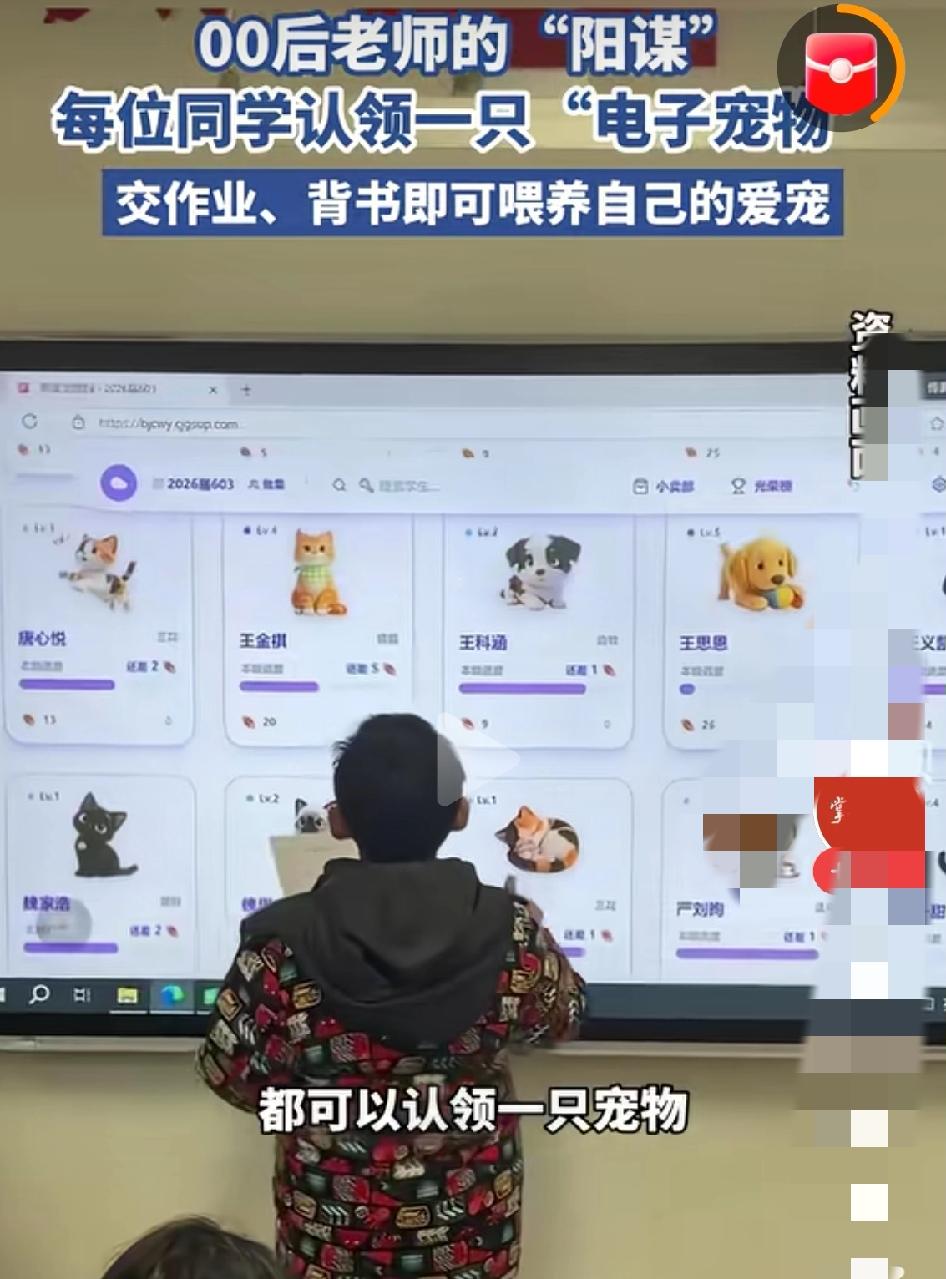 这才是教育该有的样子!00后老师的“阳谋”,把全班同学拿捏得死死的。 山西这位年轻老师太会了,给每个孩子都认领了一只“电子宠物”,交作业、背课文就能给宠物喂食升级,要是偷懒,小心把你的小宠物饿瘦甚至饿“没”。 你想想,以前催作业、追背书,老师得磨破嘴皮子,现在孩子们为了养好自己的小猫小狗,一个个主动得不行,生怕自己的爱宠落后于人。这种把学习任务包装成养宠任务的方式,既满足了孩子的责任心和成就感,又悄无声息地把学习变成了一件好玩的事。 比起苦口婆心的说教,这种“哄着学”的方式,才是真正懂孩子的教育。用游戏化思维解决学习痛点,把枯燥的任务变成有趣的养成体验,难怪家长们都在夸:这老师太懂怎么拿捏娃了! 要是你上学时遇到这样的老师,会不会也为了养宠物主动卷起来?你觉得这种“电子宠物”教学法,能长久帮孩子养成好习惯吗?