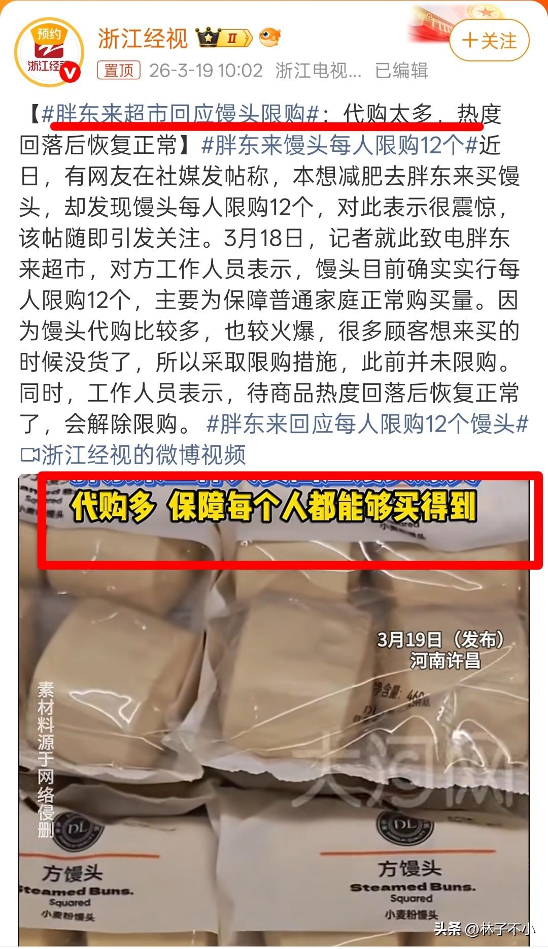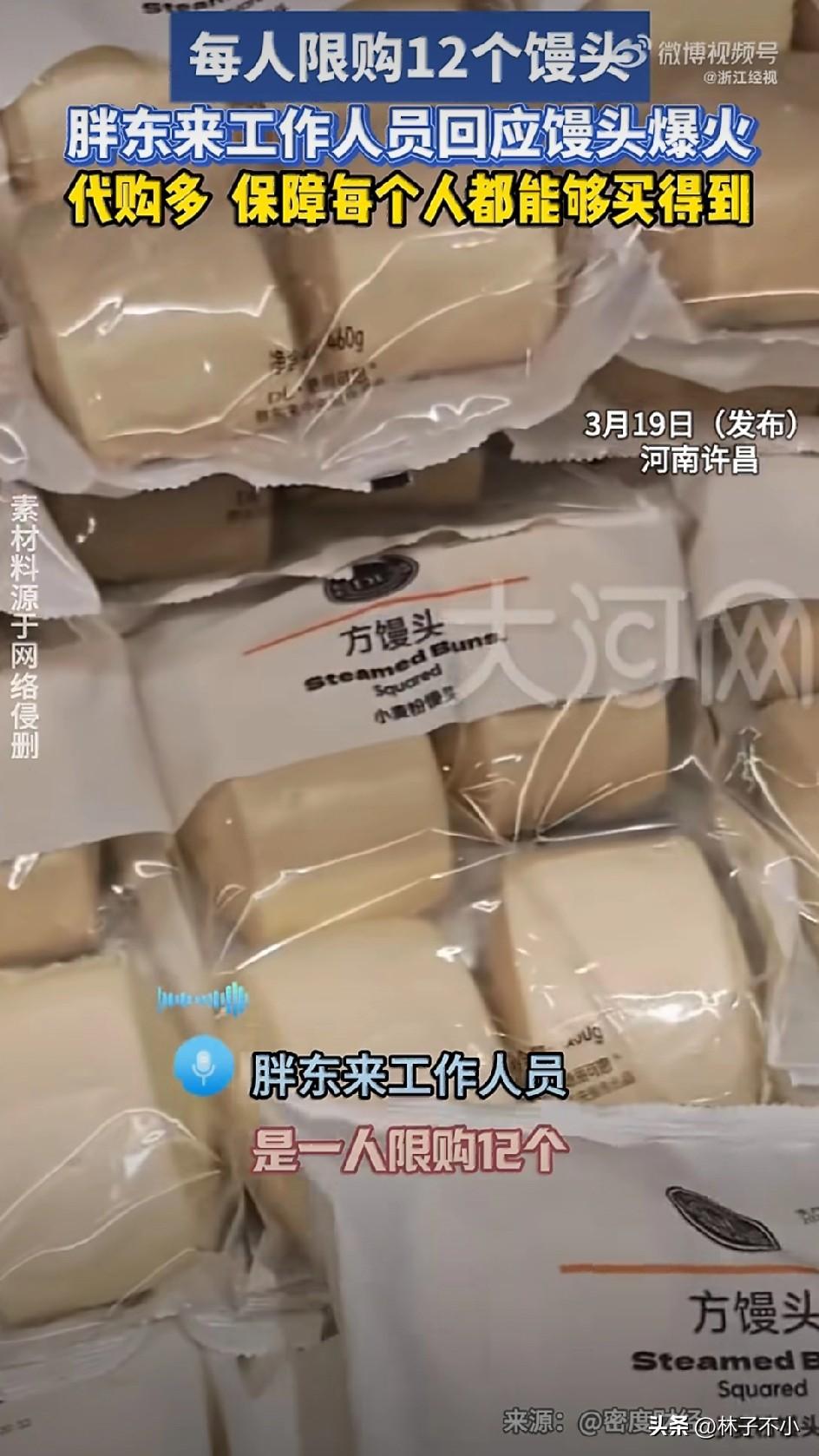 闻所未闻,绝对罕见! 买个馒头都要搞限购,而且明确了限购数量,每人12个。 如果不了解真相,这事听起来就是离谱至极,但了解完真相,反而能够理解为何要限购了。 近日,有网友发文称,胖东来的馒头开始限购了,并且是限购每人12个。 此事一出,网上讨论的那是一个热闹非凡。 有表示不理解的,有说风凉话的,也有看热闹的,总之各种争议层出不穷。 为了了解事情的真相,3月19日,浙江经视媒体对此进行了报道,此前,记者向胖东来的工作人进行了落实。 胖东来的工作人员明确告诉记者,此前确实没有限购,但后来由于代购的太多,为了保障普通家庭正常购买量,所以不得不进行了限购,后期等热度降下来了,限购就会取消了。 事情的原委讲完了。这件事的核心问题就是代购把馒头垄断了。结果正常购买的人买不到馒头了,弄的胖东来不得不干预了。 馒头被限购虽然听起来很荒诞,但我觉得还是能理解的,我的理由如下: 第一,合理的代购,我个人觉得是能够接受的,比如帮亲朋友好友购买,但也仅限于日常所需,但一旦想通过垄断,谋取暴利,这就有点过分了。 第二,每人12个馒头,这个数量还是合理的,对于普通家庭的采购,这个足够满足生活所需了。 第三,如果放任代购,首先会影响普通家庭的采购,其次会导致扰乱市场行情,从而有可能会引发一系列的连锁反应,比如消费者体验,物价混乱,食品安全没有保障等等问题。 所以综合来看,限购确实是最好的办法。 虽然馒头限购情有可原,但这事始终让人觉得有点滑稽,搞得吃不起饭了似的,毕竟馒头也算不上稀有“物种”! 还有一件事我表示不理解,不懂就问:这跟自己在家亲手做的馒头又有什么区别呢?真的有必要凑这个热闹吗?人是不是要有自己的判断呢? 对此,你又是怎么想的呢? 限购规则 胖东来 胖东来超市回应馒头限购