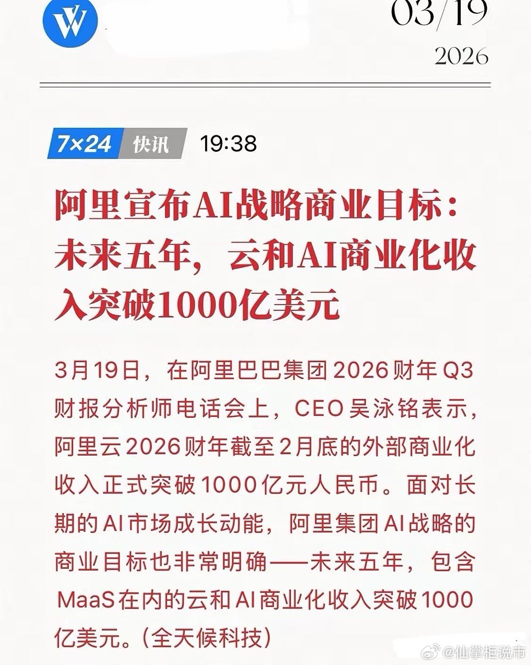 5年1000亿美元?阿里彻底“明牌”,中国云智能要掀翻全球牌桌!3月19日,CEO吴泳铭在财报会上立下“军令状”:未来五年,云+AI商业化收入必须突破1000亿美元! 这绝非是画饼,而是基于实打实的战绩——2026财年,阿里云外部收入已率先冲破1000亿人民币大关。5年1000亿美元,这是什么概念?这意味着阿里要在全球科技巨头混战中,硬生生撕开一道口子,让中国云智能成为世界级的印钞机。从1000亿人民币到1000亿美元,这是要从中国第一向全球顶级的跨越。为何此时敢放如此狠话?因为风向已彻底转变,当全球还在为大模型“烧钱”焦虑时,阿里已打通MaaS(模型即服务) 的变现闭环。从卖算力到卖智能,阿里正在把技术变成真正的“现金奶牛”。未来五年,将是阿里云和AI的黄金收获期,掌握了算力,就掌握了财富密码,抱紧巨头大腿或许是你翻身的最快机会!