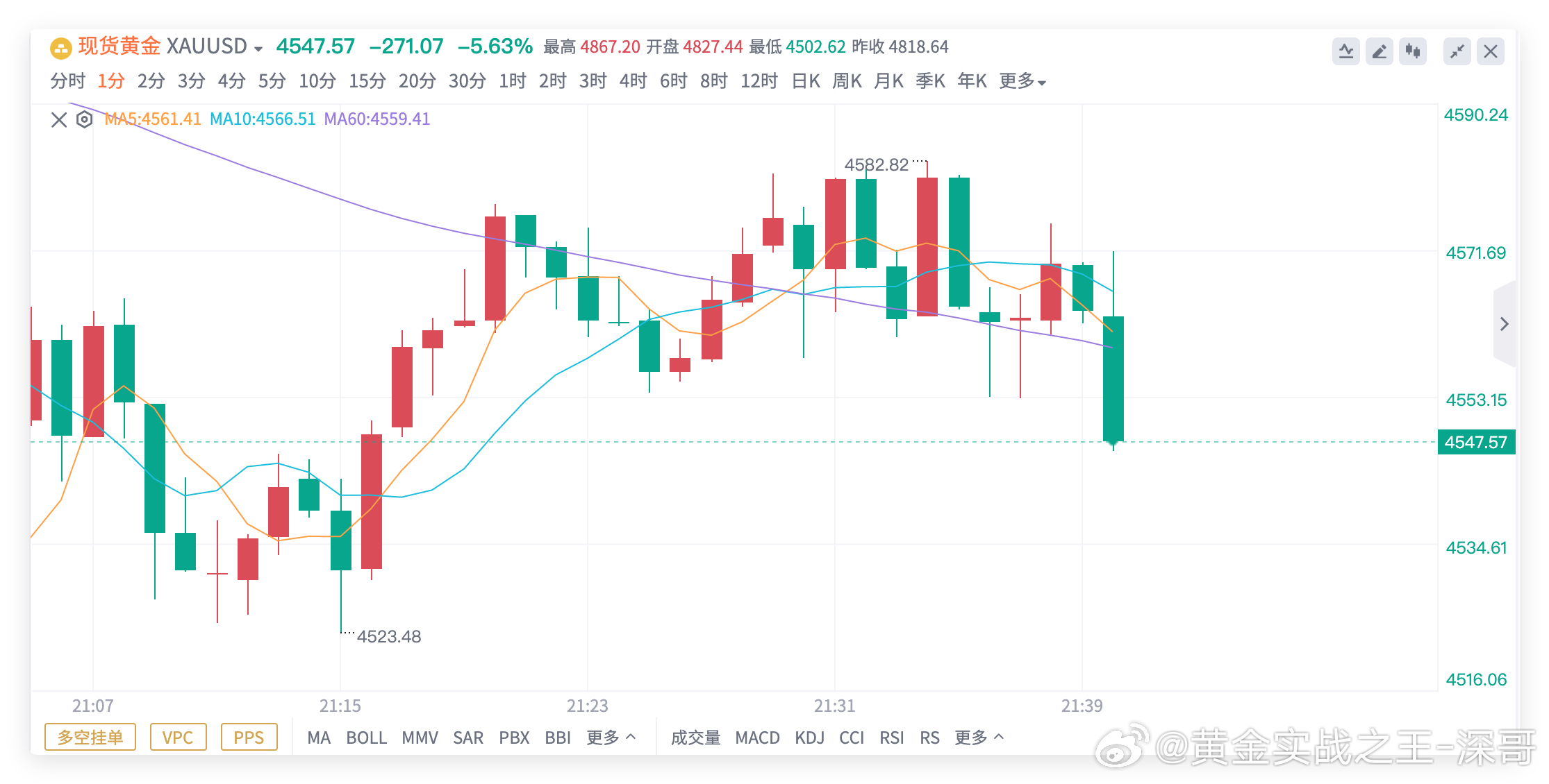 黄金4580空,抵达4550,获300点!来不及解释了,收米走人!黄金跌个没完