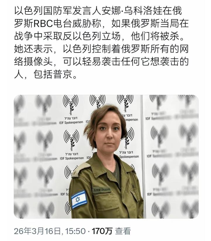 这是要挑起第三次世界大战?以色列果然是全人类公敌! 以色列军方发言人这次说话太过分,完全不讲分寸。她公开威胁俄罗斯,如果站在反以立场,就会被杀。还说以色列控制俄罗斯的网络摄像头,能随便攻击目标,甚至威胁到俄方高层。 她话里话外都是,以色列能耐大得很,只要他们想打的,谁都不会安全。 这话一出来,别说俄罗斯人,全世界看热闹的都惊着了。这哪是普通的外交表态,这几乎是公开的、赤裸裸的威胁,对象还是俄罗斯这样的军事大国。 感觉就像街头吵架,一方直接掏出了家伙事,还告诉对方“你家里几扇窗户我都知道”。 这位发言人叫安娜,是以色列国防军的新闻官。她在节目里那个态度,非常强硬,把之前针对伊朗高官的事拿出来举例,就是为了证明“我们说到做到,有这能力”。 她特意提到能控制网络摄像头,这个说法很有意思。咱们平头老百姓都知道,现在满大街都是摄像头,要真能被别国随意控制,那等于你整天在别人眼皮子底下,毫无隐私和安全可言。 这招属于心理震慑,目的就是让你从心里发毛,觉得防不胜防。不过说实话,这话水分肯定有。 俄罗斯也不是吃素的,关键部门的安防系统哪那么容易让人家远程“接管”?但这种话放出来,制造恐慌和不确定性的目的就达到了。 这就好比有人对你说“我知道你手机密码”,你可能不信,但心里总会咯噔一下,忍不住去检查一下。 俄罗斯那边的反应呢?也挺刚。 其实就在这事前几天,俄方外交部刚发声明,严厉谴责美国和以色列袭击伊朗,用词很重,说是“背信弃义的侵略”,两边这算是杠上了。 而且还有个背景,前不久以色列的空袭把黎巴嫩的一个俄罗斯文化中心给炸了,俄罗斯当时就跳脚了。 所以啊,以色列发言人这番狠话,可以看作是之前一系列摩擦的升级,是一种公开的警告:老大哥,你批评我、甚至暗地里给伊朗递点东西,我们都忍着,但你要是明着站到我们的对立面,那咱们这“默契”可就破了,后果你想清楚。 这事在国际上怎么看?咱们这边,我们外交部表态了,对以色列高官这类“想杀谁就杀谁”的言论感到震惊,认为不可接受。 这态度很明确,不赞成这种绕开国际规定、单方面威胁的做法。再看看中东其他地区,土耳其、沙特、巴基斯坦等一堆国家,也纷纷谴责以色列最近的行动。 以色列这么一搞,在中东朋友圈里是越混越窄,几乎快成“全民公敌”了。但它好像不太在乎,反而有点“破罐子破摔”,谁敢出头就怼谁,连俄罗斯都敢直接警告。 那以色列为啥要这么干?可能有几个原因。 一是内塔尼亚胡政府在国内压力不小,用对外展示“肌肉”来转移矛盾,是政客的老套路了。 二是,它可能真急了。伊朗和它的代理人力量,在黎巴嫩等地越来越活跃,让以色列觉得如芒在背。 而俄罗斯在中东的存在和对伊朗的某种支持,是以色列最忌惮的变数。它说这话,就是想一巴掌拍在桌子上,吓住俄罗斯,让你别轻易插手。 不过,这也反映了现在国际上一个不好的苗头:传统的、大国间“斗而不破”的微妙规则正在被打破。 一些小国,或者地区强国,在处理争端时越来越倾向于用极端言论和边缘政策,先把嗓门吼到最大,把底线划到最前,试图用“谁敢惹我我就跟谁玩命”的姿态来吓阻对手。 这其实很危险,容易误判,容易引发更严重的矛盾。 咱们再往深了想想,战争威胁这东西,到底吓唬的是谁?最终受苦的,永远是无辜的平民。中东那块地方,打了几十年,老百姓日子过得提心吊胆。 大国在这里博弈,争的是地缘利益、是能源、是影响力,可炮火落下去,毁掉的是一个个家庭、一所所学校、一座座医院。 以色列发言人的话,听着是威胁俄罗斯的高官,但真正让人后背发凉的,是那种对战争和杀戮的轻描淡写,是把人的生命当作政治筹码的冷漠。 虽说国与国之间,有矛盾、有利益冲突太正常了。但解决问题,靠威胁、靠暗杀、靠放狠话,绝对不是正道。 这就像村里两户人家有矛盾,一家天天拿着刀在另一家门口比划,这日子还能过吗?整个村子都得跟着紧张。国际社会需要的是对话的桌子,而不是互相瞄准的枪口。 总是挥舞大棒,四处树敌,短期内可能让人害怕,但长期来看,朋友越来越少,路越走越窄。 真正的安全,不是建立在让所有邻居都害怕你的基础上,而是建立在相互尊重的基础上。现在全世界都盼着疫情之后经济能好起来,老百姓能过点安生日子,真的经不起新的、大的冲突了。 希望相关各方,特别是那些手里有枪、说话有分量的,能多点理智,少点冲动。把狠话的劲头,用到谈桌上试试。 毕竟,和平这个词,写起来简单,实现起来难,但它值得所有人,尤其是那些掌权者,为之付出百分之百的努力。普通人就图个安稳日子,这要求,不算高吧?