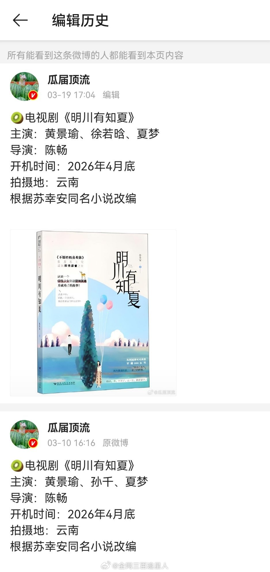 黄景瑜的明川有知夏上周还是搭孙千 这周就变成了徐若晗,没到开机谁知道呢