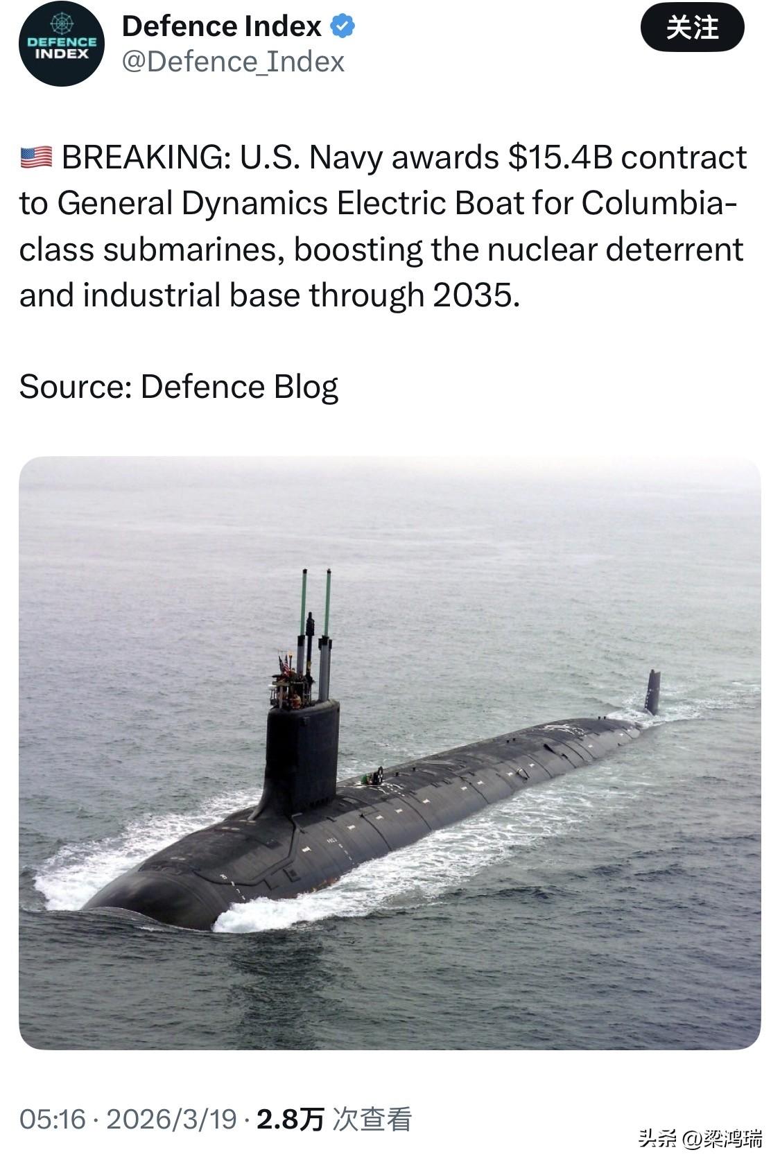 《国防博客》突发新闻:美国海军授予通用动力电船公司价值 154 亿美元的合同,用于建造哥伦比亚级潜艇,这将增强核威慑力量和工业基础,直至 2035 年。