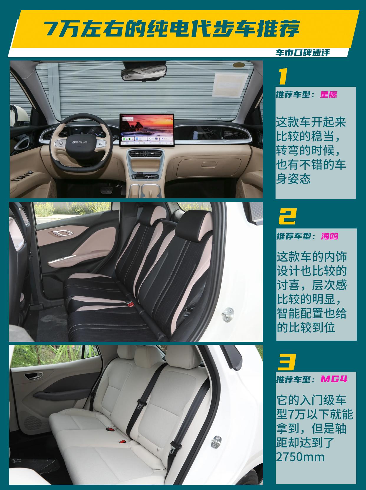 新能源时代的到来,给汽车市场带来了很多的变化,也影响着大家的消费选择。如果你预算在7万元左右,想选一款合适的代步车,可以看看以下三款纯电轿车,都是比较热销的产品。 1、吉利星愿 这款车是目前最热销的纯电小车了,7万左右可以买到410km的版本,如果平时代步的话,这个里程数就足够了,如果每天行驶50公里左右的话,一个多星期充一次电就行。这款车还是一个后驱的类型,在同级中属于比较有特点的了。这款车开起来比较的稳当,转弯的时候,也有不错的车身姿态,驾驶起来挺有质感的。 2、比亚迪海鸥 海鸥是比亚迪旗下的明星车型。我很喜欢海鸥的造型,不同于其他小型车的造型,这款车的外观甚至有一些机甲的风格在,车身上拥有较多硬朗的线条,在轮眉和侧裙方面,还有一些黑色的包围,给到了不错的运动感。另外,这款车的内饰设计也比较的讨喜,层次感比较的明显,智能配置也给的比较到位。 3、MG4 这款车给我的感觉就是“厚道”,它的入门级车型7万以下就能拿到,但是轴距却达到了2750mm,从轴距、车长等角度来看,这款车都有比较大的优势。后排的座椅还能放倒,空间表现非常突出。更重要的是,这款车的续航在这几款车中是最高的,综合性价比非常的高。 所以这三款车怎么选?要空间大、续航实在,选MG4;要驾驶质感好,星愿的后驱有一定优势;海鸥的有比亚迪的三电背书、颜值也很高。综合下来,还是看自己的需求,建议去试驾一下。【来自懂车帝车友圈】