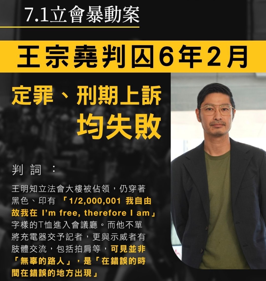 大快人心,乱港艺人王宗尧判刑6年2个月。上诉后维持原判。