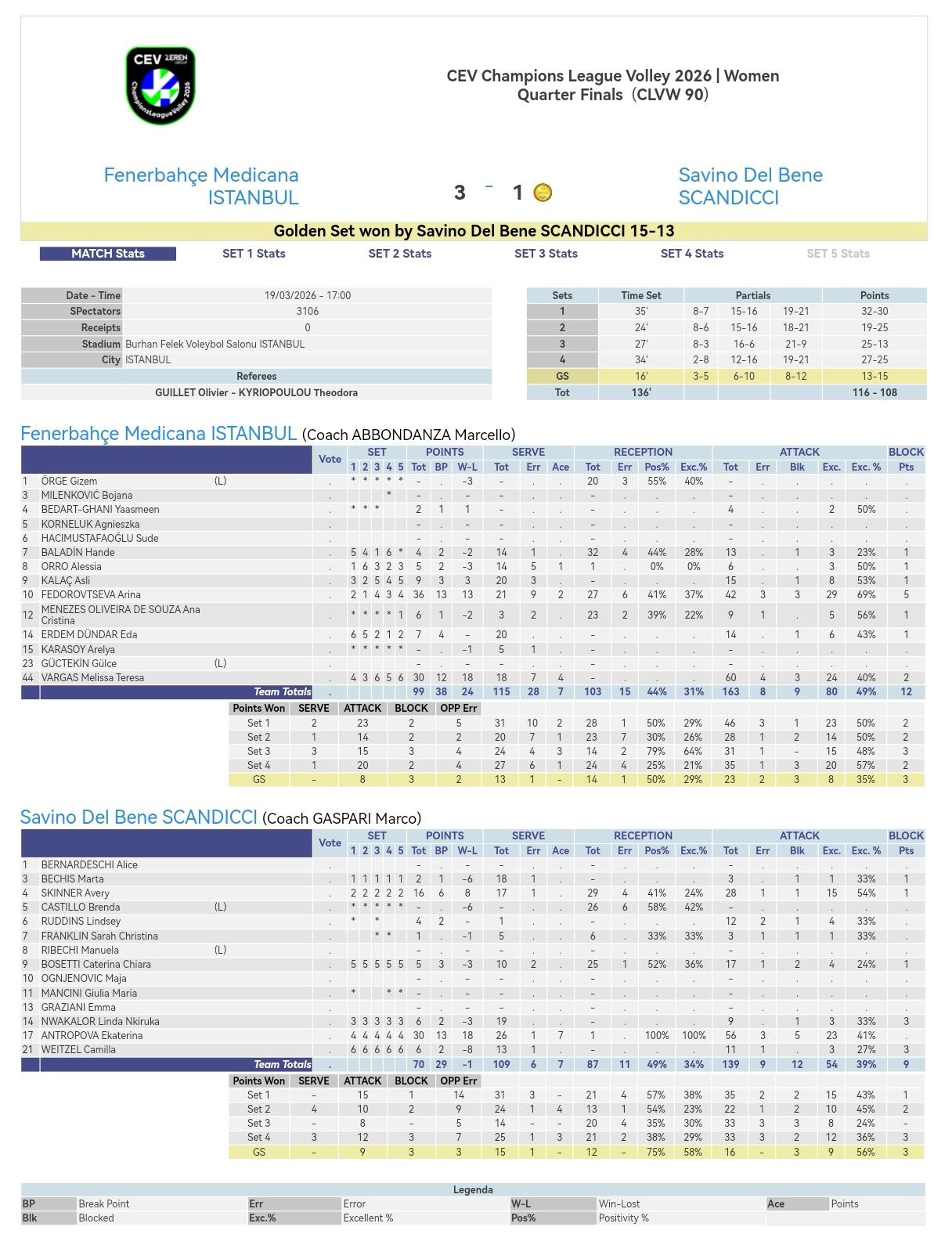 斯坎迪奇金局淘汰费内巴切 2025-2026女排欧冠半决赛次回合,费内巴切主场3-1战胜斯坎迪奇,双方场分1-1战平,金局对决费内13-15告负,斯坎迪奇晋级四强,比分32-30, 19-25, 25-13, 27-25+13-15。小彩娃36分全场得分王,安娃30分7个ACE,荣膺MVP。 费内巴切: 费多洛夫塞娃42扣29中3失3被拦、5拦2发36分 瓦尔加斯60扣24中4失3被拦、2拦4发30分 卡拉奇15扣8中0失1被拦、1拦0发9分 埃达14扣6中0失1被拦、1拦0发7分 克里斯蒂娜9扣5中1失0被拦、1拦0发6分 奥罗6扣3中0失0被拦、1拦1发5分 巴拉登13扣3中0失1被拦、1拦0发4分 贝达特-加尼4扣2中0失0被拦、0拦0发2分 斯坎迪奇: 安特罗波娃56扣23中3失5被拦、0拦7发30分 斯金纳28扣15中1失1被拦、1拦0发16分 恩瓦卡洛9扣3中0失1被拦、3拦0发6分 魏策尔11扣3中1失0被拦、3拦0发6分 波塞蒂17扣4中1失2被拦、1拦0发5分 鲁丁斯12扣4中2失1被拦、0拦0发4分 贝奇斯3扣1中0失1被拦、1拦0发2分 富兰克林3扣1中1失1被拦、0拦0发1分 费内巴切-斯坎迪奇: 扣球得分:80-54 拦网得分:12-9 发球得分:7-7 对方送分:17-38 总得分:116-108 一传到位率:44%-49% 一传完美率:31%-34% 斯坎迪奇 费内女排
