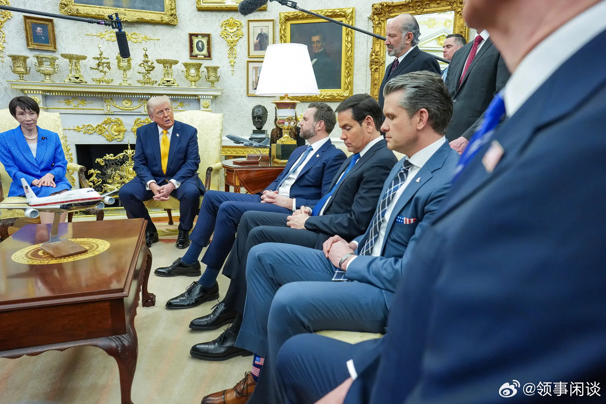 特朗普先生讲话时,高市睁大了眼睛,似乎深吸了一口气。她双臂交叉放在膝上,一言不发。