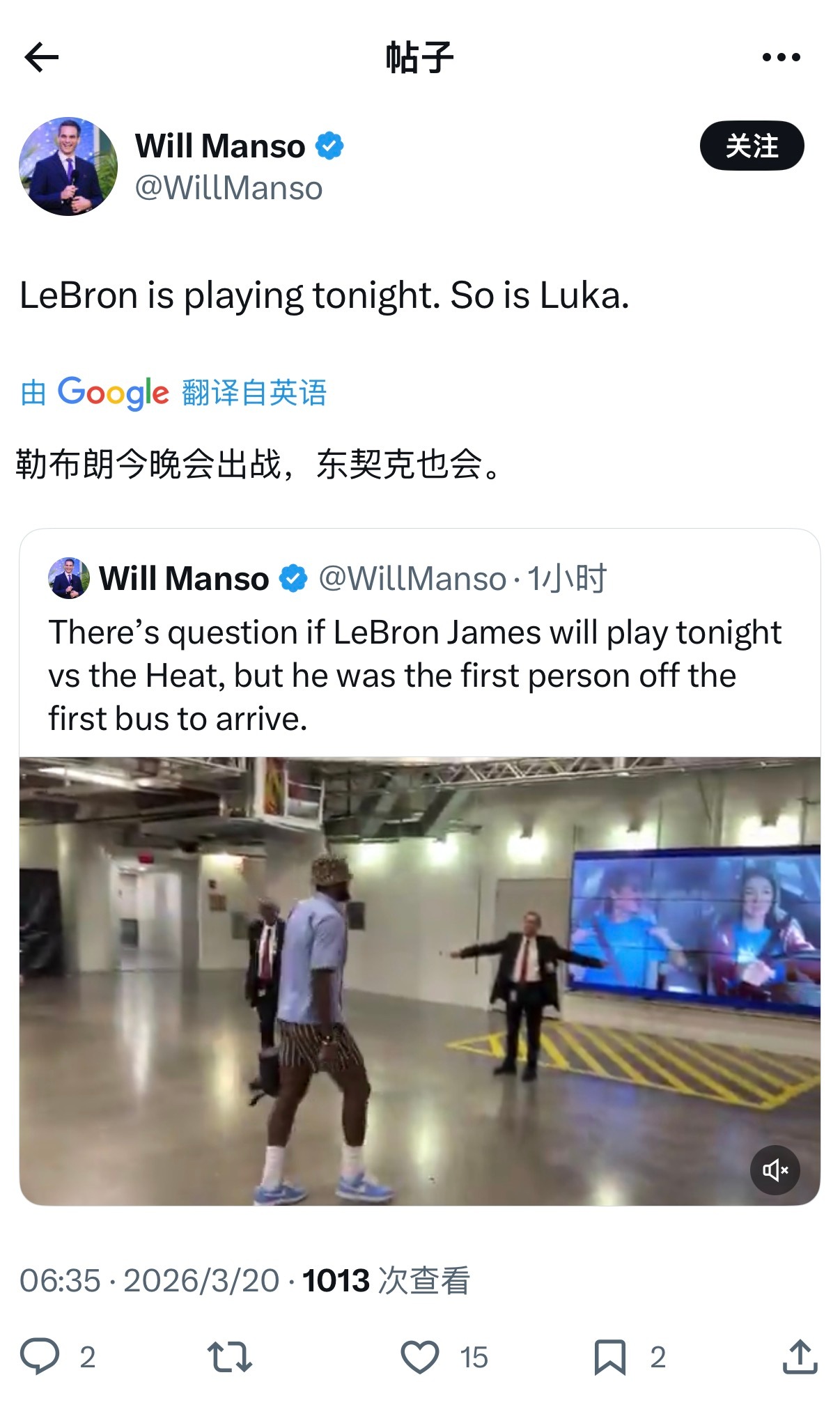 老詹和东契奇今天会打,里夫斯赛前决定。洛杉矶湖人