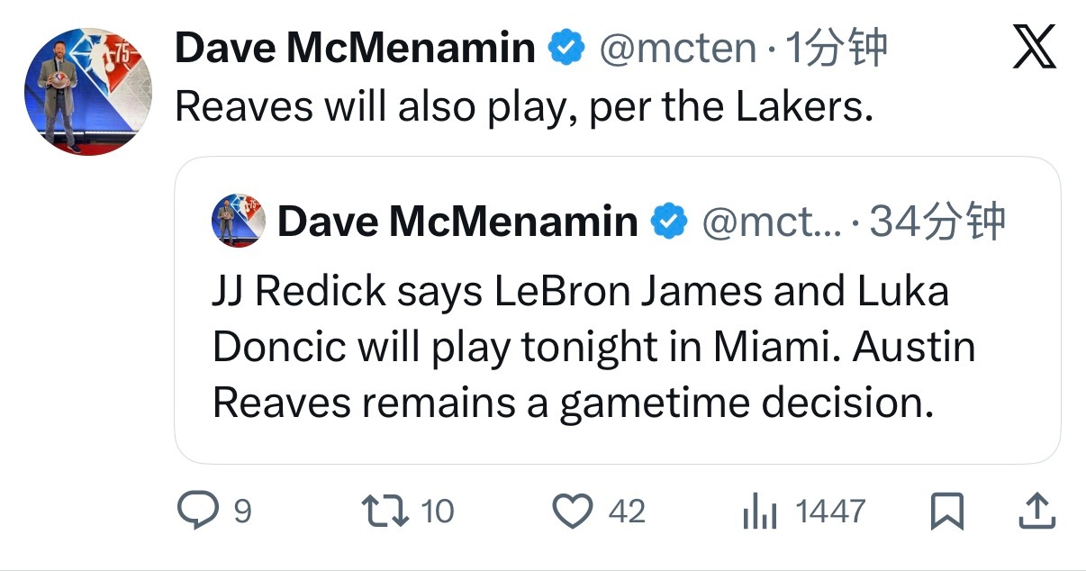 里夫斯也将出战。里夫斯