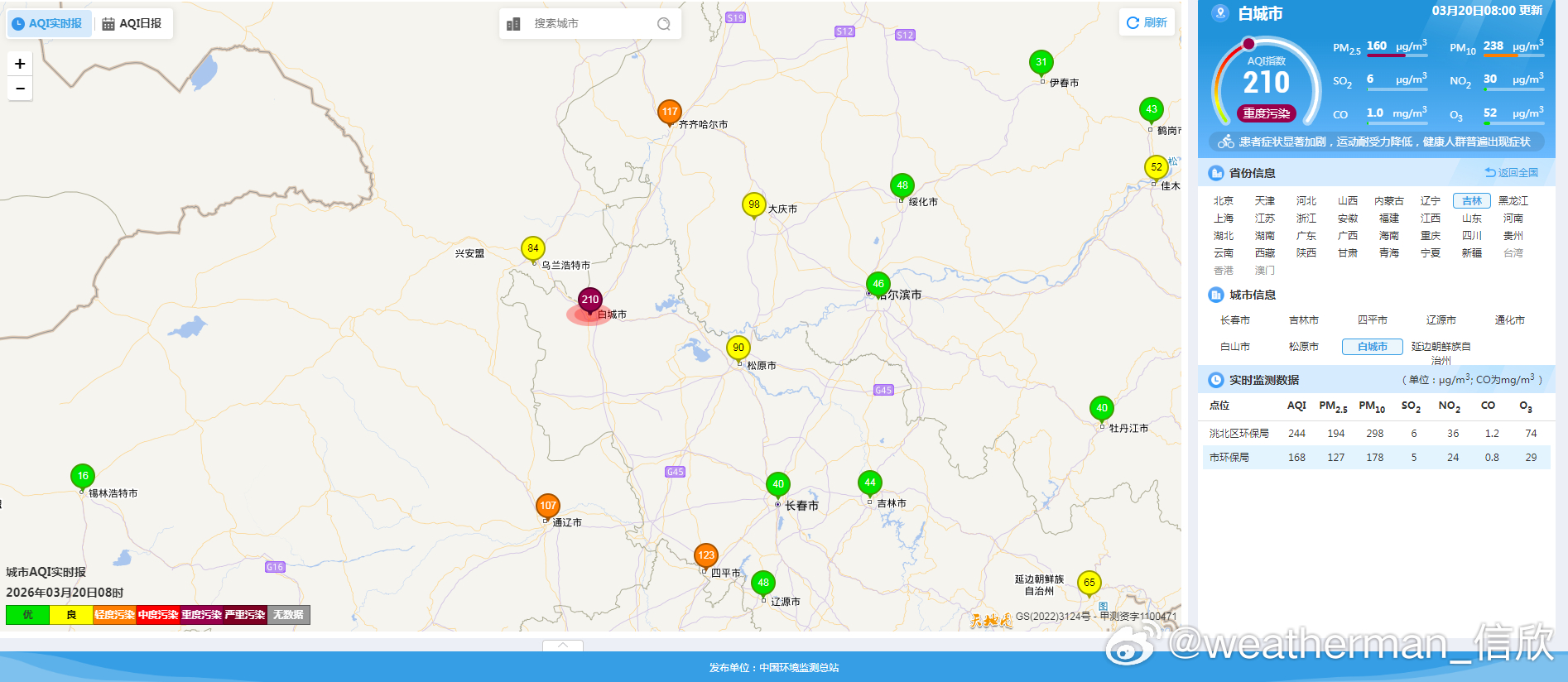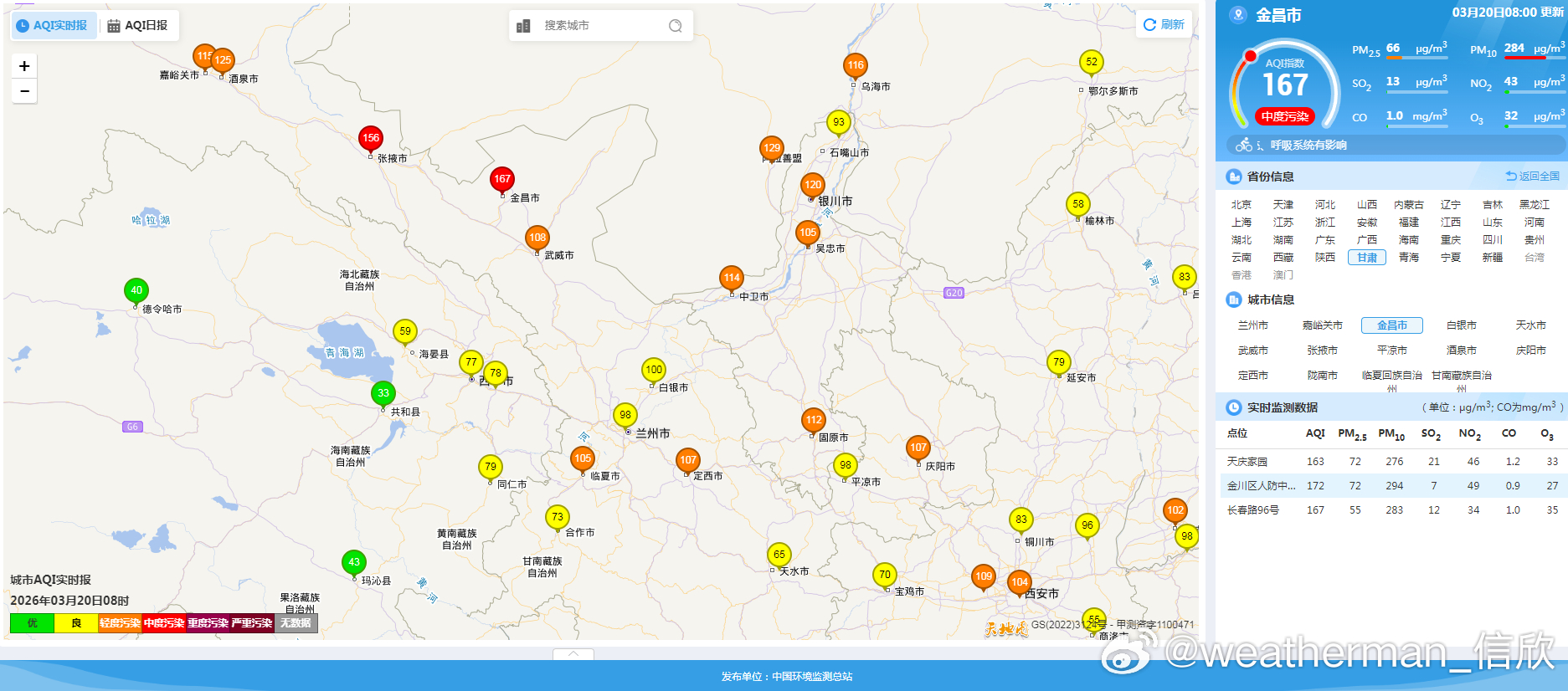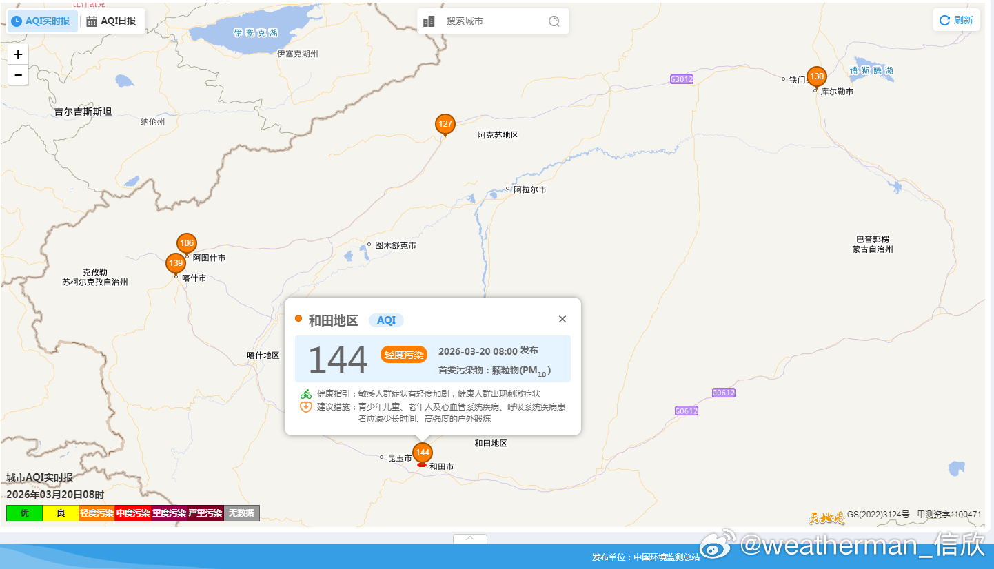 从今晨空气质量看,从华北到长江中下游等地,存在轻度污染,江苏宿迁有中度污染,此外吉林西部的白城有重污染,首要污染物为PM2.5,对应有霾。在新疆塔里木盆地、甘肃多地、宁夏,陕西部分地区有沙尘污染,首要污染物为PM10。