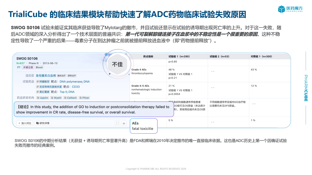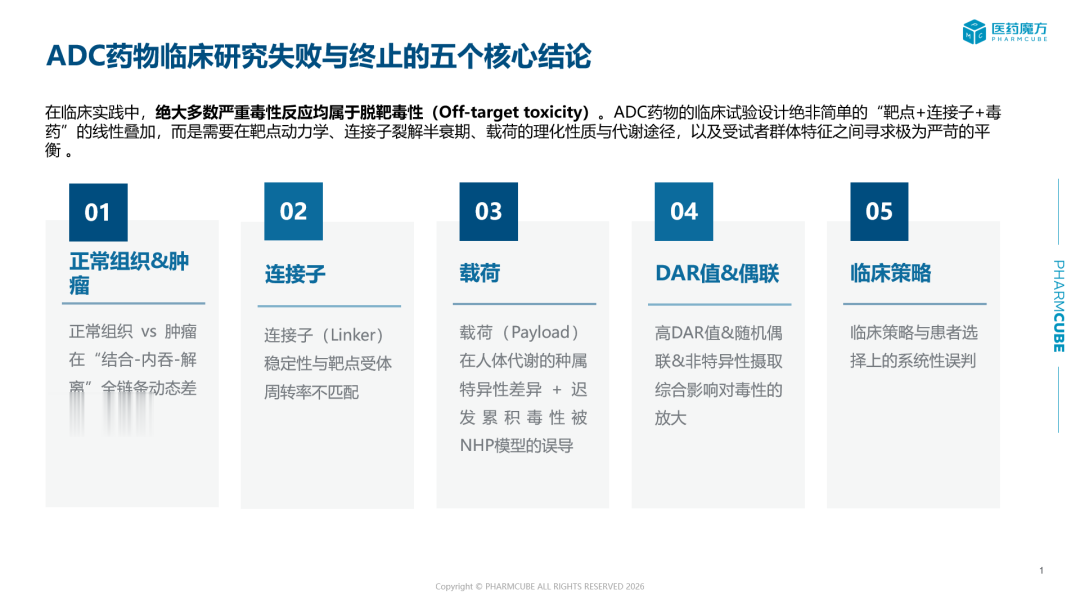 ADC药物的临床试验设计绝非简单的“靶点+连接子+毒药”的线性叠加,而是需要在靶点动力学、连接子裂解半衰期、载荷的理化性质与代谢途径,以及受试者群体特征之间寻求极为严苛的平衡。3月25日(周三)18:30,医药魔方将举办深度直播《ADC药物临床研究失败与终止原因综合分析》,通过对大量失败案例的复盘,提炼出ADC临床研究最核心、最致命的五大失败原因,欢迎扫码预约直播。