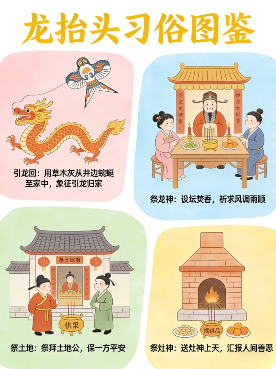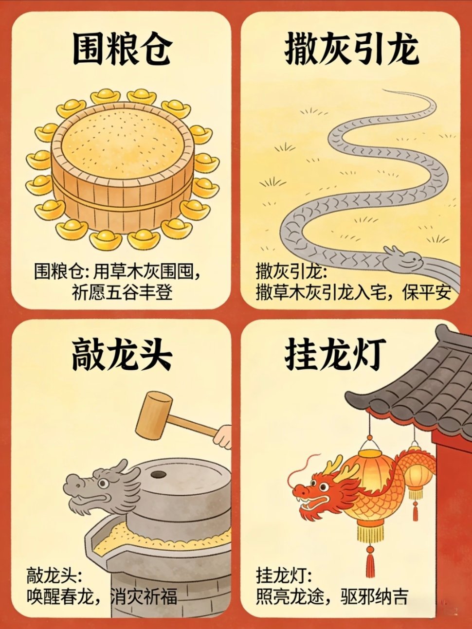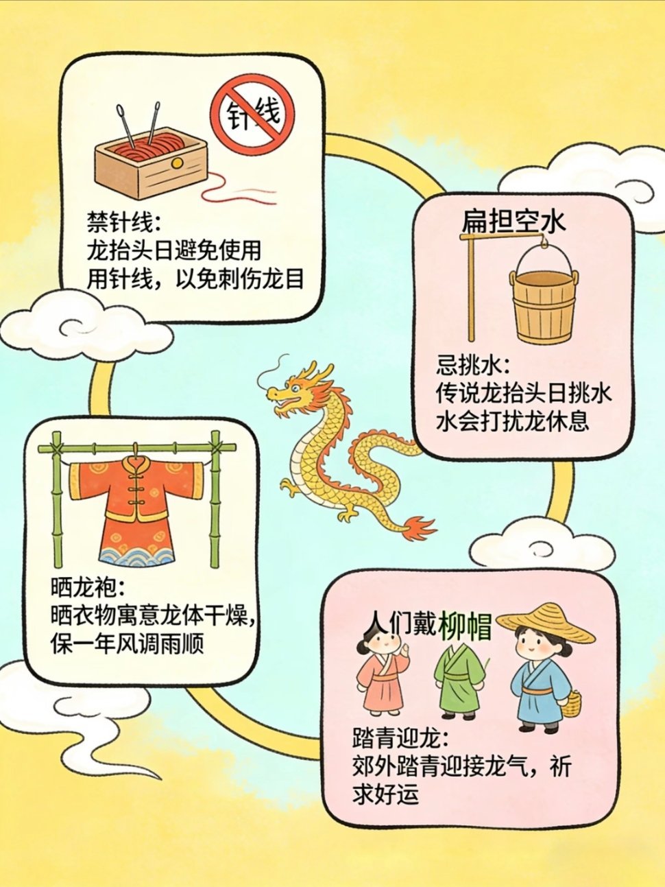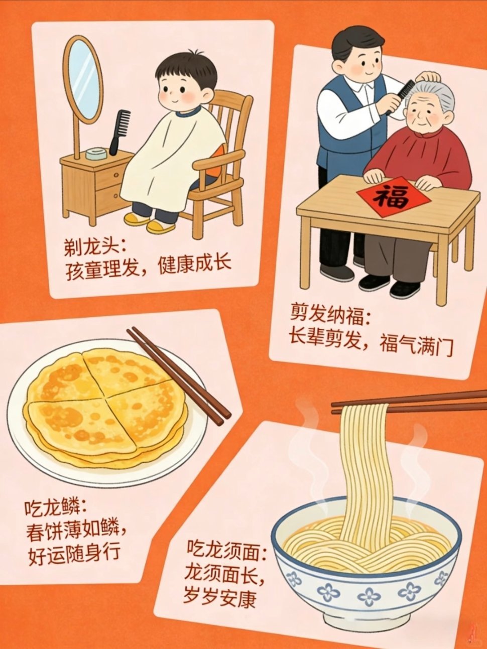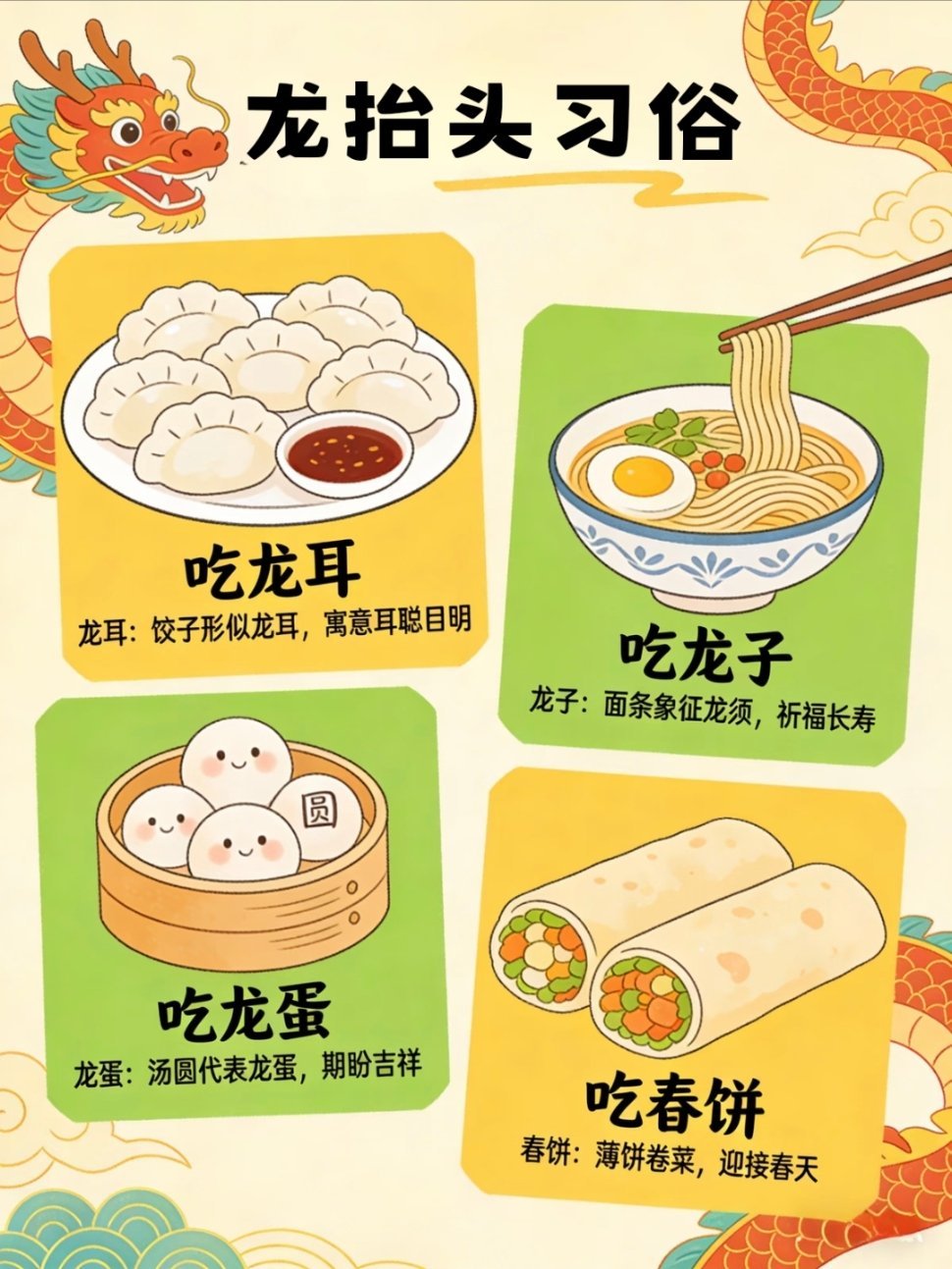 二月二龙抬头应该吃点啥二月二龙抬头,春回大地,万物复苏,传统民俗满满 仪式感剃龙头: 这天理发,剪去旧岁烦恼与疲惫,大人剃龙头迎好 运,孩子剃喜头护平安,从头开始顺一整年。 吃龙食 :吃饺子叫“龙耳”,吃面为“龙须”,吃春饼称“龙 鳞”,以食纳福,寓意五谷丰登、生活有滋有味。引龙回: 以灰引龙归家,祈龙赐福降雨,保佑风调雨顺、虫害 不侵,农家期盼岁岁丰收。晒龙衣: 晾晒衣物被褥,借龙气除霉祛湿、驱邪避灾,愿全家 安康无病,家宅清净吉祥。 祭龙神 :祭拜龙王,敬天祈雨,寄托着人们对平安顺遂、家业 兴旺的美好心愿。 春龙抬首,鸿运当头,愿新岁事事顺心 ,步步皆好运。