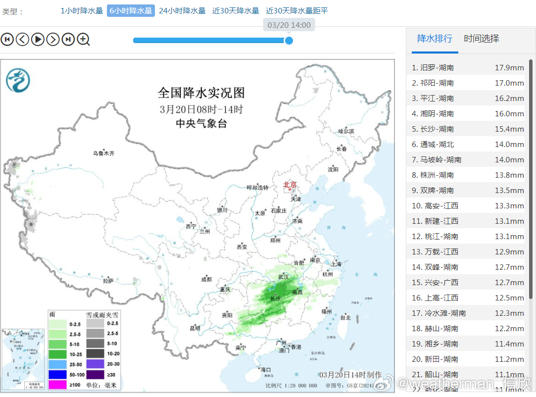 从08-14时降水实况看,降雨主要在广西北部-湖南-湖北南部-江西一带。从雷达动画看,降水逐渐东移。今天下午到明天中午,江南和华南北部,还有大范围降雨。另外西藏西南部可能有明显降雪。