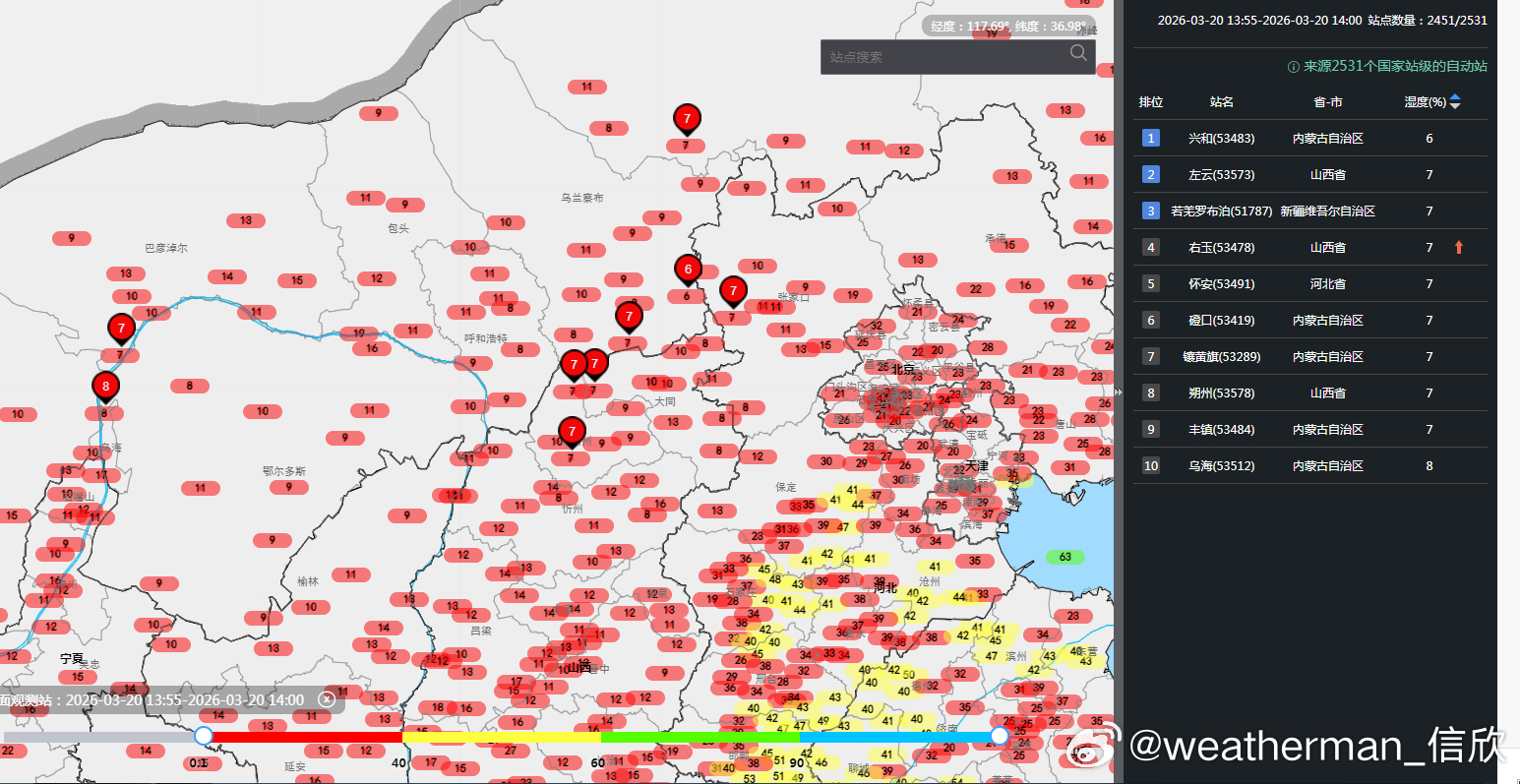 【降水和湿度】今天又是南北方干湿分明的一天。下午14时,内蒙古山西等地,相对湿度