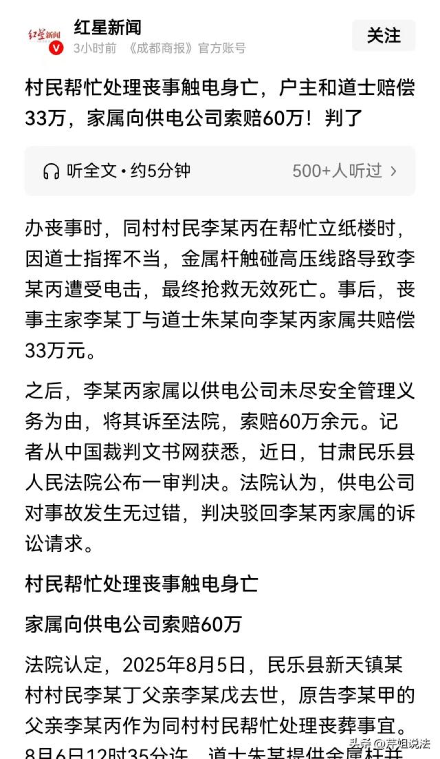 甘肃张掖,家中老人离世,家属请了道士帮忙办后事,道士指挥同村村民立纸楼时失误,纸楼上的金属杆碰到高压线,搬纸楼的村民当场触电离世。案发后主家和道士赔偿了村民家属33万元,但是家属认为,高压线是供电公司拉的,所以供电公司也要赔偿,于是起诉索赔60万。 2025年8月5号,民乐县新天镇某村的一位老人离世了,子女放完鞭炮,村民都知道了他家的事,纷纷过来吊唁。 离世老人的儿子也一家一家过去磕头,请村里德高望重的人过来帮忙主持丧事。 很快,子女在主事人的帮助下开始紧锣密鼓开始处理老人的后事,主事人找人请了道士过来超度。 8月6日上午,道士朱某带着丧事要用的东西就位了,并指挥过来帮忙的热心村民布置现场,李某就是过来帮忙的村民之一。 中午12:30左右,朱某指挥村民们摆放扎好的纸扎物品,其中村民李某几个人携手搬动一座纸楼。 朱某把自带的金属杆递给李某,让他们使用金属杆辅助,还叮嘱他们小心一点,别把纸楼弄坏了。 几人在朱某的指挥下,一点一点移动纸楼,把它摆放到指定位置,意外就在此时发生。 原来,朱某递过去的那根金属杆直直的竖在纸楼边上,朱某指挥他们的时候,没有注意到上方的高压线。 纸楼移动过程中的,金属杆碰到高压线,抬纸楼的4个人都触电了,旁边的村民发现不对立即施救,其他三人没有大碍,但是李某却在送去抢救途中离世了。 李某好心过来帮忙,结果却把自己的命搭上了,家属怎么都无法接受,非要让主家和道士朱某赔钱。 那么,从法律角度来看,主家和朱某是否需要赔偿? 首先,李某给主家帮忙属于义务帮工。 依据《最高法关于审理人身损害赔偿案件适用法律若干问题的解释》第四条规定,无偿提供劳务的帮工人,在从事帮工活动中致人损害的,被帮工人应当承担赔偿责任。 李某是出于热心,在老人离世后主动过来帮忙,没有收取任何报酬,符合义务帮工的构成要件。 李某在搬动纸楼时触电离世,属于在从事帮工活动中遭受人身损害。作为被帮工人,主家应该承担赔偿责任。 另外,主家请朱某来办理后事,双方形成了委托关系,作为活动的组织者,主家对整个葬礼的安全负有一定的注意义务。 但是在这起事故中,主家的责任相对间接,事故主要是因为朱某指挥不当导致的。 根据《民法典》第一千一百六十五条规定,行为人因过错侵害他人民事权益造成损害的,应当承担侵权责任。 朱某的过错行为与李某的离世存在直接的因果关系,所以朱某应承担主要的侵权责任。 最终经过调解,主家和道士朱某共同赔了李某家属33万,双方达成和解。 按理说事情至此已经告一段落了,但是李某的家属不知道听谁讲的,被高压线电死的,可以起诉供电公司,能获得一笔巨额赔偿。 于是李某的家属又起诉的供电公司,要求赔偿各项损失60万。 据了解,案发地的高压线为10千伏线路,是村里为了进行水井排灌,才从供电公司拉了线。 当时,双方还签了合同,村里明确说,以后因为高压线发生的任何纠纷都由村里自行承担,和对方无关。 电线拉进来之后,平时的管理、使用都是由村里来进行的。 李某的家属起诉后,2025年10月,本案正式立案,供电公司申请追加村里为共同被告人参加诉讼。 但是在庭审过程中,李某的家属明确说不追究村里的责任,只追究供电公司的责任。 他们怎么也没想到,就是因为这句话,让后续的判决发生了天翻地覆的改变。 一般来说,因高压线产生的损害后果,供电公司都需要承担无过错责任。 这是因为,《民法典》第一千二百四十条规定,从事高空、高压、地下挖掘活动或者使用高速轨道运输工具造成他人损害的,经营者应当承担侵权责任;但是,能够证明损害是因受害人故意或者不可抗力造成的,不承担责任。被侵权人对损害的发生有重大过失的,可以减轻经营者的责任。 也就是说,只要供电公司参与了高压线的经营管理,就要承担因此产生的损害后果。 可问题是,这条电线拉进来后,供电公司就和村里签了合同,双方约定后续产生的纠纷,供电公司不承担任何后果。 并且通电后,涉案线路就由村里维护管理,供电公司实际上对线路没有巡查、检修、维护的义务,也没有参与经营。 所以说,这种情况下,供电公司是不用承担无过错责任的,由此产生的责任已经移交给了村里。 但是庭审的时候,李某家属又明确表示不追究村里的责任,这也意味着他们放弃了向村里索赔的权利。 最终经审理认为,原本村里是涉案电路的产权人和经营人,对事故的发生也存在过错,本应该承担责任,但李某家属自愿放弃,应予以支持。 最终,李某家属的索赔请求被全部驳回。