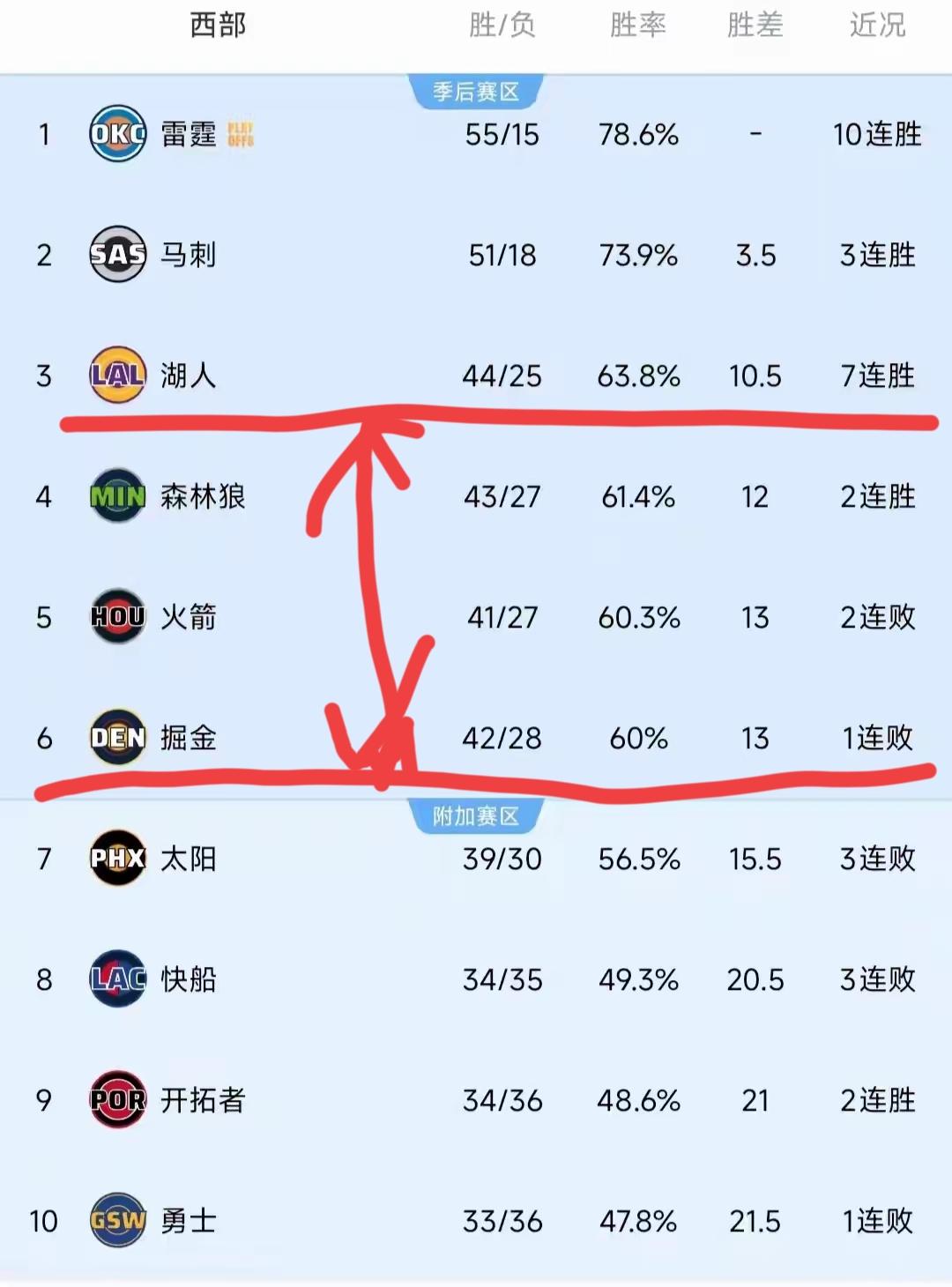 阴谋论又来!掘金放水、提前挑对手? 湖人昨天战胜火箭,三天双杀,稳固西部第三。 另一边,掘金爆冷输给无欲无求的灰熊,排名直接掉到第六。 于是阴谋论又来了:掘金故意放水,就为季后赛打湖人! 先不说现在湖人七连胜、状态正猛,到底是不是前六里最好拿捏的。 就一个最现实的问题: 常规赛还剩十几场,西部3—6名随时大变天! 现在就放水挑对手,是不是也太早了? 排名都没定,你知道最后能对上谁? 掘金这场更多就是状态松懈、客场背靠背没打好, 跟“故意挑湖人”半毛钱关系没有。 别再拿阴谋论抹黑两支球队了! 真要碰季后赛,谁怕谁还不一定呢!