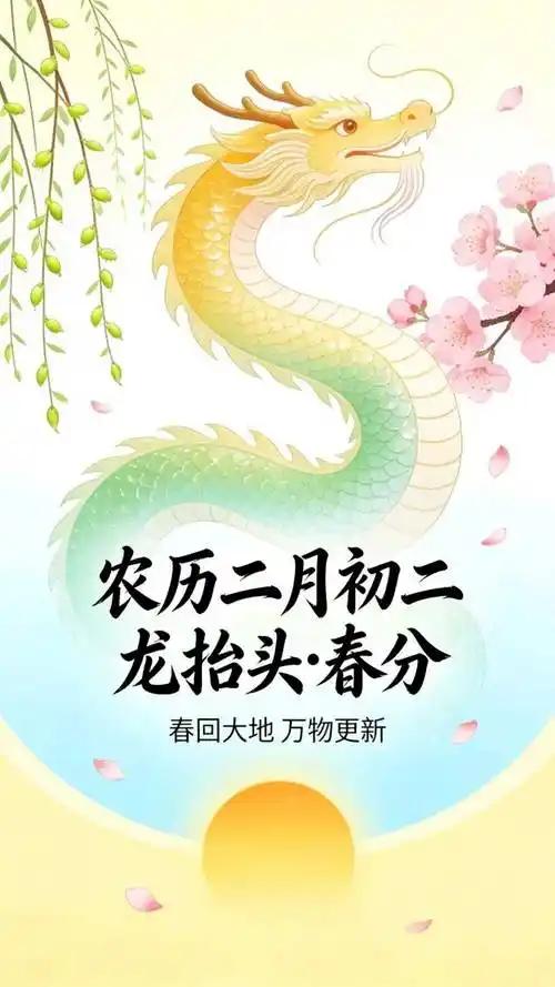 你知道2026年的3月20日既是春分又是“龙抬头”吗?这一天有哪些特别的习俗呢? 2026年3月20日的“龙抬头”不仅标志着春分的到来,还蕴含着丰富的民俗文化。这一天,全国范围内的主要习俗包括“剃龙头”,寓意辞旧迎新、好运当头。山东地区则流行“撒灰引龙”,通过撒草木灰形成粮仓形状,祈求五谷丰登、家庭安康。饮食上,北方人喜欢吃猪头肉、龙须面和饺子,南方人则偏好吃馄饨,各种美食都带有美好的寓意。此外,还有不洗头、不洗衣、不泼脏水的习俗,以避免冒犯龙神,带来财运流失。这些习俗不仅体现了人们对美好生活的向往,也展示了中国传统文化的独特魅力。 二龙二抬头祝福 创意龙抬头祝福