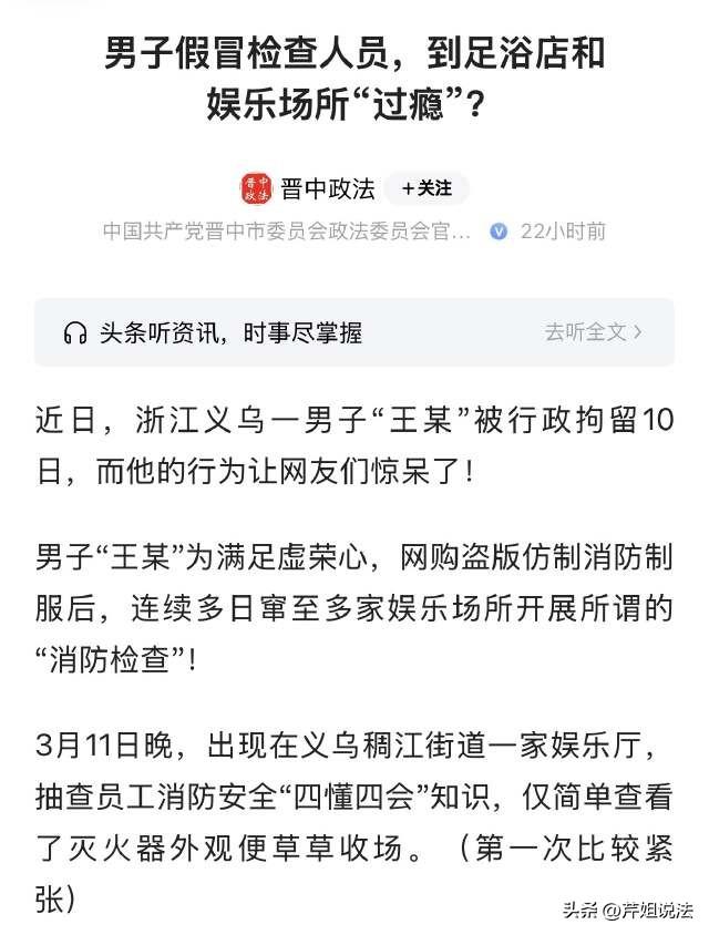 浙江义乌,一男子网购了仿制的消防人员穿着的制服,回家试穿之后,不仅很合身,看起来还很正气,为了满足自己的虚荣心,男子前往多家足浴店、按摩店、娱乐场所等,去开展所谓的“消防检查”。男子声称,看到店内员工对自己很客气、甚至还一脸的崇拜,他深深体会到“被人尊重”的感觉。 就是这样的奇葩行为,男子要为自己“假冒”的行为买单,最后的他悲催的很。 晋中政法3月19日报道了这则新闻。 这个新闻真的是又搞笑、又可气,让人看了之后,内心多了一丝心酸。 义乌的一名男子王某,平时实在是太闲了,为了给自己刷存在感,他竟然想到这样做。 王某很喜欢出去一些娱乐场所,也遇到相关部门办案,他们办案的细节、过程,都让王某很羡慕,他时常感觉:要是我也是队伍中的一员,该有多好啊。 说办就办,王某还真的把这件事,当个事儿办了。 他留意到这些办案人员在处理事件时候的神态、询问话术等,全都铭记于心。 之后,王某就到网上去购买了一套假冒的消防衣物制品。虽然是仿冒的,但是乍一看,似乎就跟真的一样。 到货之后,王某立刻就在家试穿,穿上衣服之后,王某在镜子前面左看右看,自己都被眼前“威风”的自己给吸引住了。 回头,为了满足自己的虚荣心,王某就正式出动了,他准备外出“办案”了。 王某穿上了假冒的衣服,拎着一个公文包,一身正气的出现在一家练歌厅。回头还喊来了一排的工作人员,要求他们把店内的消防装置出示给自己看。 之后店员非常听话的把消防器材拎过来,让王某查验。 而王某因为第一次做这件事,内心其实有些心虚的,也就简单的查看了一下器材就草草收场,直接离去。 但是这一次体验完,王某回家之后,心里那叫个得意啊。每每回想起店员听从安排、言听计从的样子,王某嘴角不禁上扬,面露笑意。 有了第一次,就会有很多次,之后,王某先后在义乌北苑、稠江街道的4家娱乐场所再次开始“展开工作”,主要还是进行检查。 在假冒进行检查工作的时候,王某仍然是继续抽查员工消防安全的“四懂四会”知识,这次,王某又体会了一把被人尊重的感觉。 直到走进一家足浴店“例行检查”,这次王某碰壁了。 进入足浴店之后,没想到店老板非常精明,一眼就看出王某的猫腻,因为他眼神、表情、话术都不是很专业。 店老板则询问:“请问您是哪家的执法人员?” 王某居然被这句话给问的蒙圈了,一时间神情开始错乱,答非所问。 慌乱之中,王某说:“我的另外一组同事在隔壁的酒店检查。”当时店老板就留意住了,让身边的员工去核查。 但是核实之后,发现隔壁酒店并没有这类检查事宜。 足浴店的员工立刻察觉不对,赶紧就跑去管辖区内的管理站举报,并且还把这件事的相关线索移交给了有关部门。 这下王某就慌了神,得知自己的违法事件被曝光。随后,他自己前往了相关部门主动投案,并且如实供述自己的违法行为。 办案人员询问:“你为什么要这么做?” 王某则一五一十交代了自己的犯罪心迹,他表示,实在是太羡慕那些执法人员了,感觉他们很正气。 最后,王某虽然没有骗取钱财,也没有索要好处,但是他的假冒行为已经干扰了管理秩序,最后被处以了10日的行政拘留处罚。 要说王某的处罚,可真的是一点都不冤枉。 根据《治安管理处罚法》第六十二条规定,假冒相关部门工作人员招摇撞骗,此举涉嫌违法,依法要受到行政处罚、甚至刑事追究。 案件中的王某,网购了消防的假制衣服,自称执法人员,在没有任何资质的情况下,进入到娱乐场所、足浴店等进行所谓的消防检查,这个行为已经涉嫌犯法。 王某这样做,这个行为不仅欺骗了经营场所的管理人员,还严重损害了公信力,破坏了队伍形象,所以终将依法惩处。 为了满足自己的虚荣心,虽然没有骗取钱财,但是已经触犯了法律红线。也幸亏王某没有继续招摇撞骗,不然情节严重的话,可能会入刑哦! 大家看完这个案例之后,是怎么看待王某的行为的呢? 欢迎评论区讨论、留言。