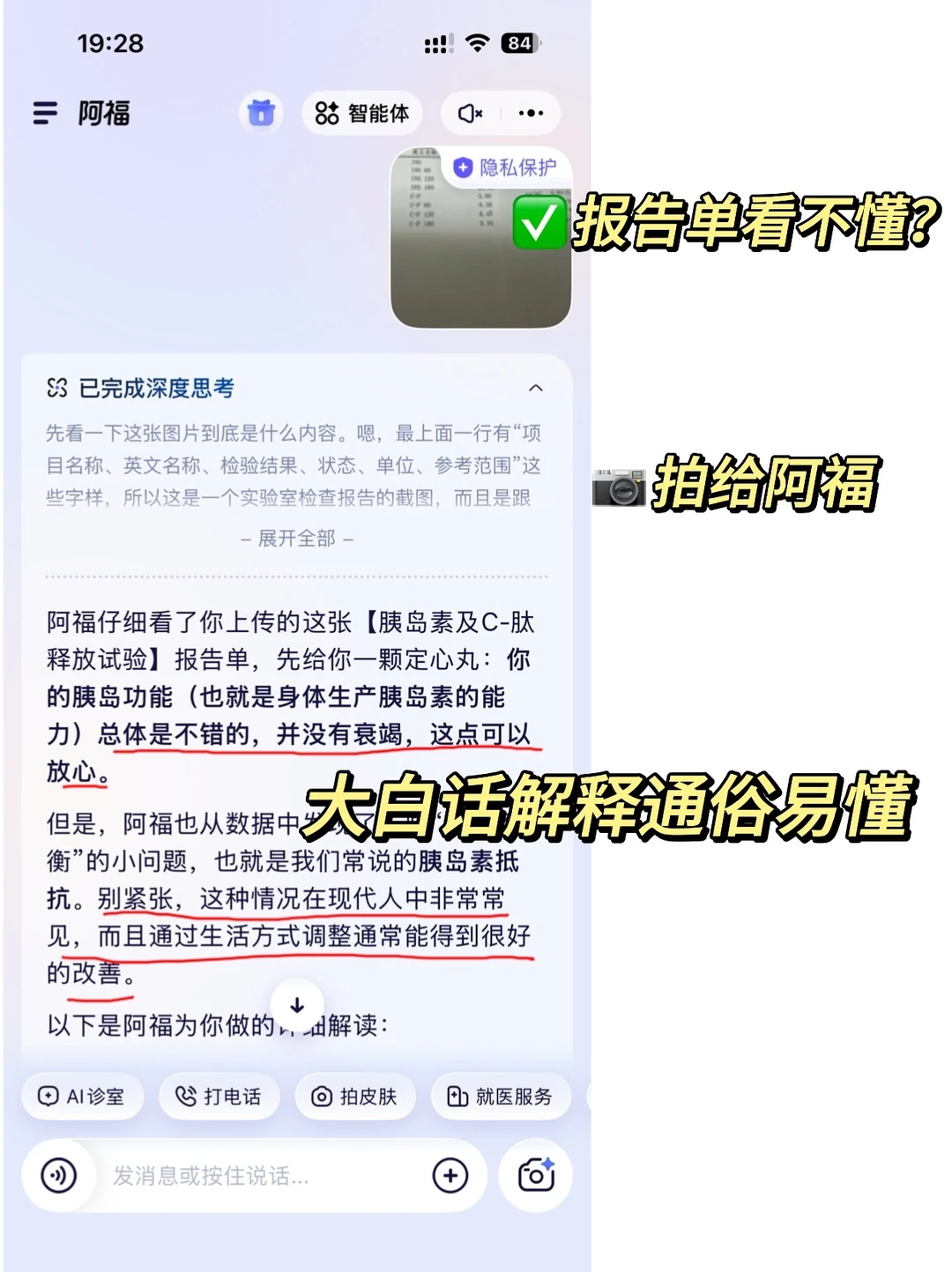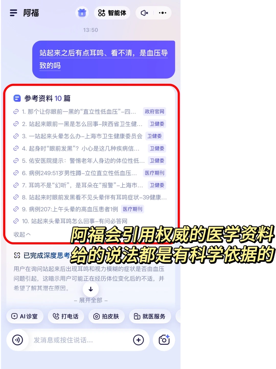 总之,身体才是革命的本钱。阿福不是普通AI,它是几千位大白、🧑⚕️院士共同训练的出来的,所以专业度是有保障的,可以放心用。