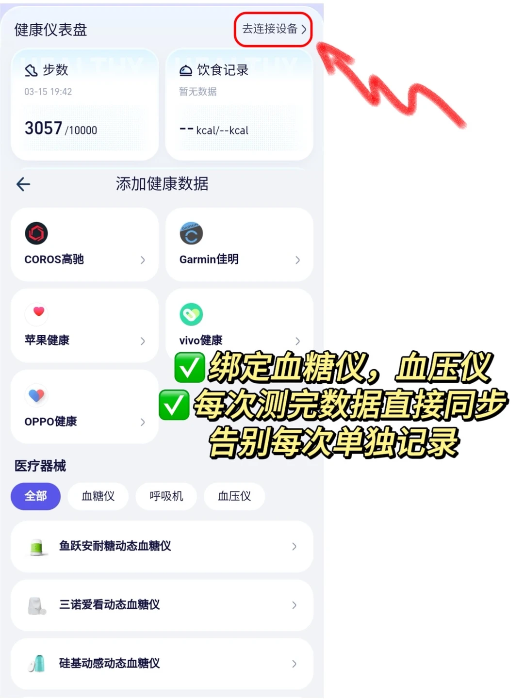 直接把血压仪、血糖仪绑到阿福的健康档案里,以后测量数据不仅能自动同步上来,还可以让阿福直接给出一段时间的变化表格,一目了然看清自己近期的身体指标动态。