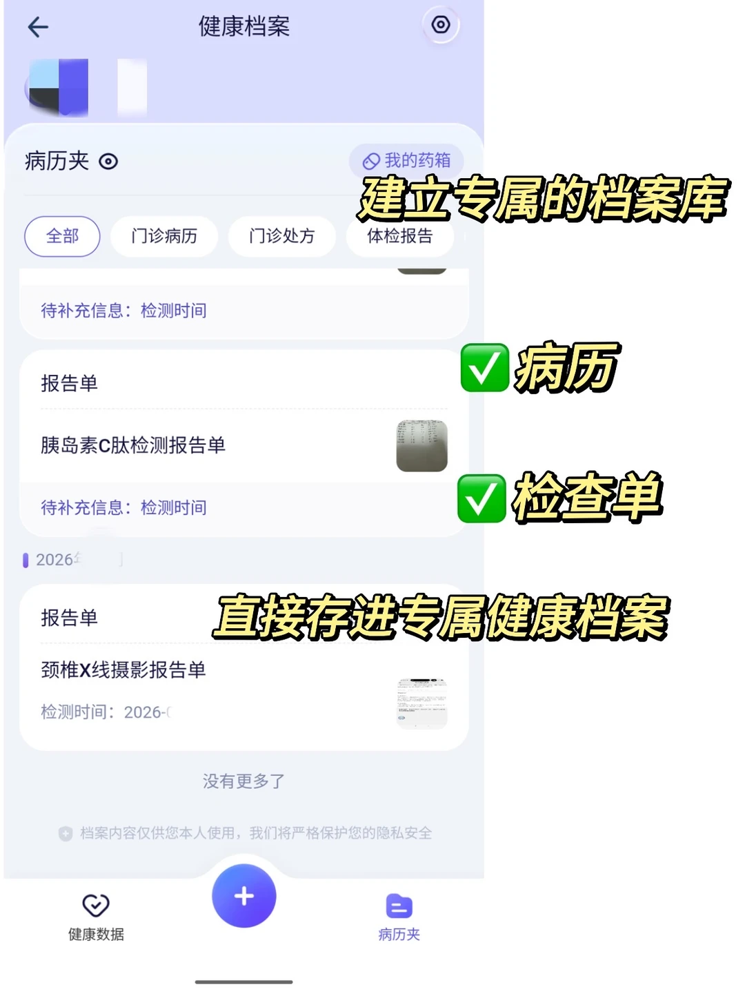 而且检查单、病历,只要拍过,就能直接存进健康档案里,之后复查也不用到处翻了。