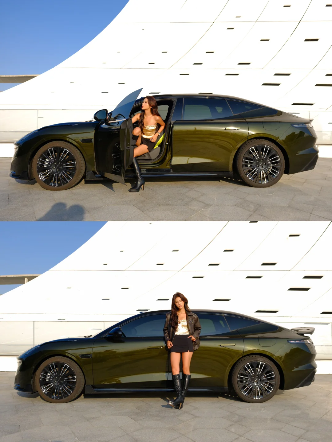 鎏光金车漆太绝了,阳光下泛着金绿渐变,像把液态金属穿在了车身上,锋曜运动套件,前唇、侧裙和尾翼让线条更凌厉,科技感十足,随手拍都是氛围感大片✨