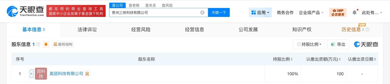 美团在贵州成立新科技公司 天眼查工商信息显示,近日,贵州三快科技有限公司成立,法定代表人为张旭准,注册资本100万人民币,经营范围为信息系统集成服务,软件开发,技术服务、技术开发、技术咨询、技术交流、技术转让、技术推广,软件销售。股东信息显示,该公司由美团科技有限公司全资持股。 天眼查信息: