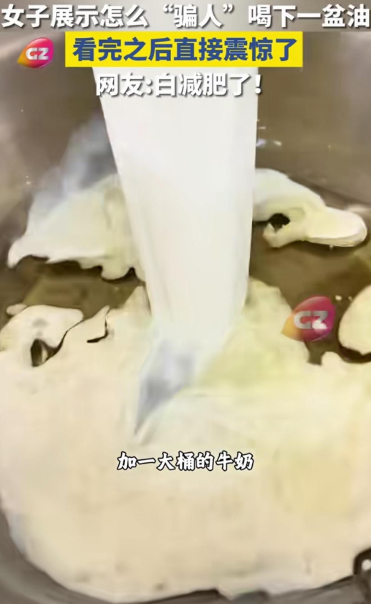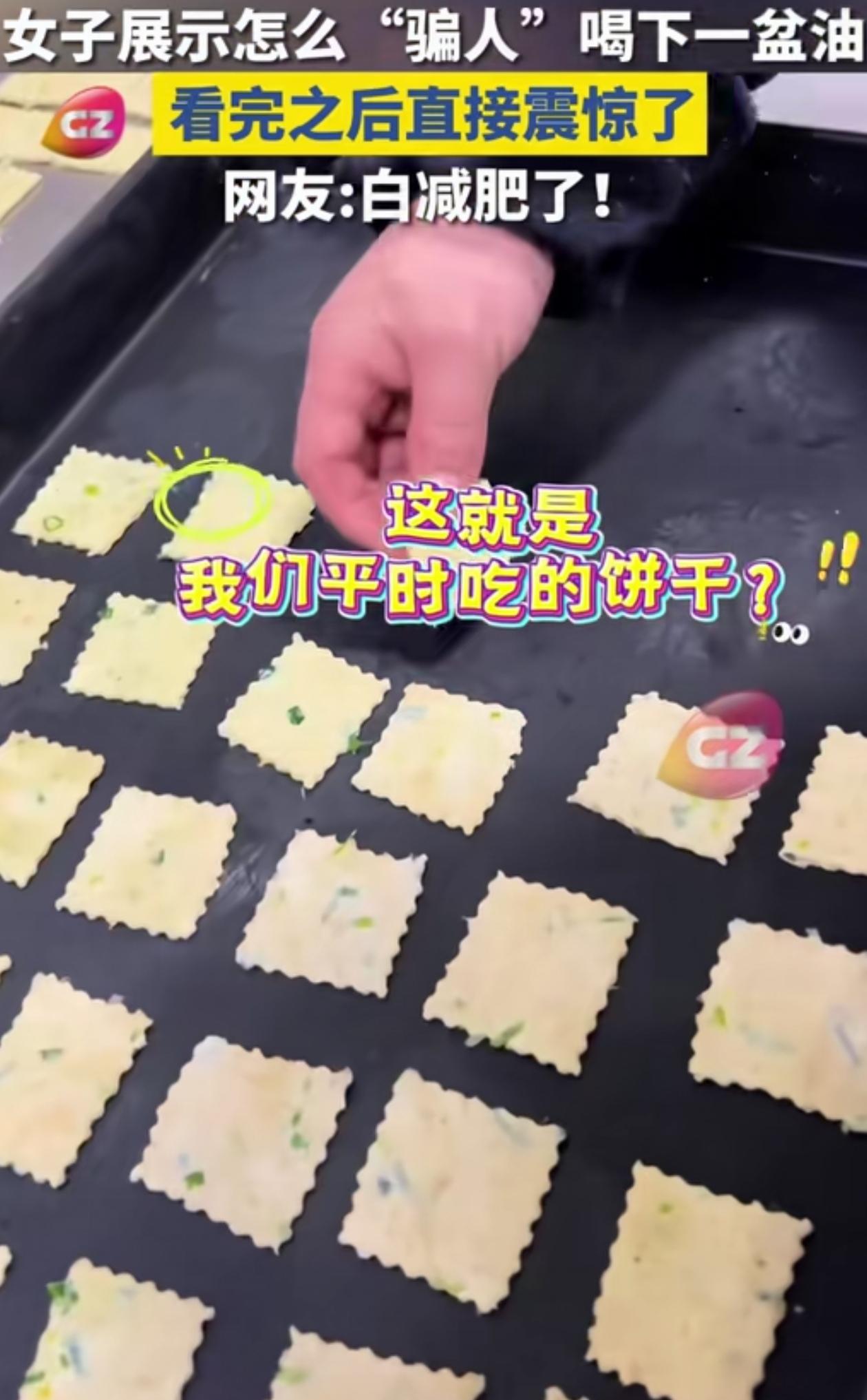“减肥没效果是有原因的”!江苏一女子拍视频,称能让大家把一盆油喝到肚子里,网友不信,结果她一顿操作,最后竟然做出了一盘子的苏打饼干,彻底把网友看破防了! 看完全程,吓得我差点把手里的苏打饼都扔了。 这位女子一开始拿来一大盆油,信誓旦旦说能让大家亲口喝下去。 大家本来都不信,没想到女子先是往里面加了一大桶牛奶,又稍微加了一点白花花的盐,紧接着又滴上了不少酵母粉。这个时候原本的油就有点看不清了,看着有点像舒芙蕾。 但还没完,女子又往上面加了不少芝麻粒和香葱,然后一顿猛搅,成功把这些东西混合在了一起。 随后只见女子把这一大盆东西加上了面粉,然后就开始醒发。结果半小时过去,原本明晃晃的一盆油,竟然摇身一变成了一块又一块的苏打饼干。 本以为吃着东西不长肉,现在才知道,里面原来全是油水啊! 有网友说她婆婆就经常吃苏打饼干,看到这个视频感觉天都塌了! 还有网友说自己一直以为苏打饼的配料是最干净的,真的没想到里面有这么多的油。 大家对这个苏打饼有什么看法吗?