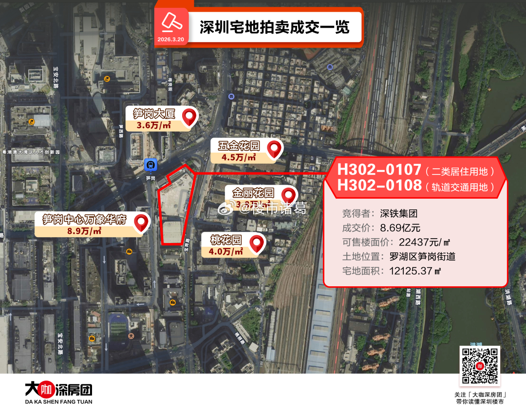 2026年深圳第一宗土拍,罗湖笋岗宅地,被深铁以底价8.69亿元拿下,综合楼面价22437元/㎡。