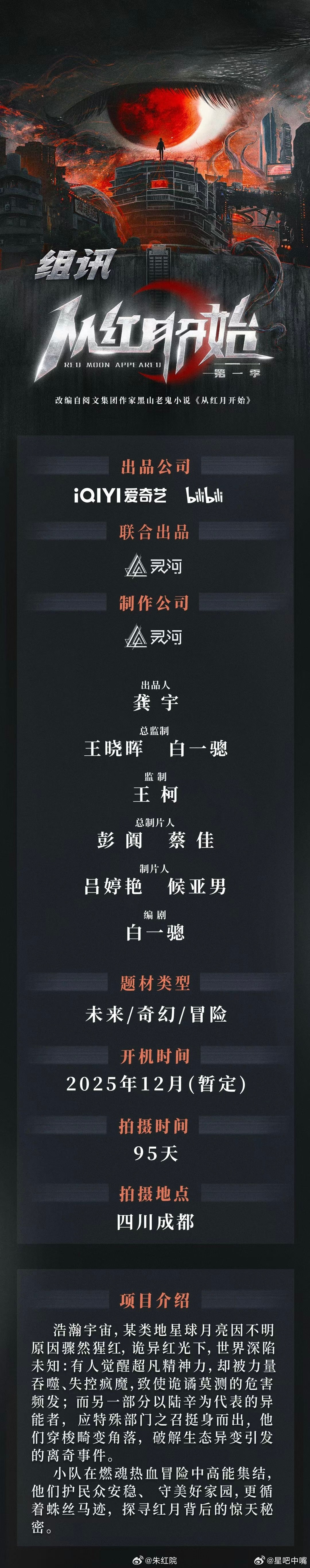 爱奇艺奇幻剧《从红月开始》4月成都开机主演阵容:郭麒麟、张子枫、翟潇闻、姜珮瑶、王圣迪、徐崴罗导演:沙维琪(很想很想你、聊斋)编剧:白一骢(天行健、盗墓笔记)