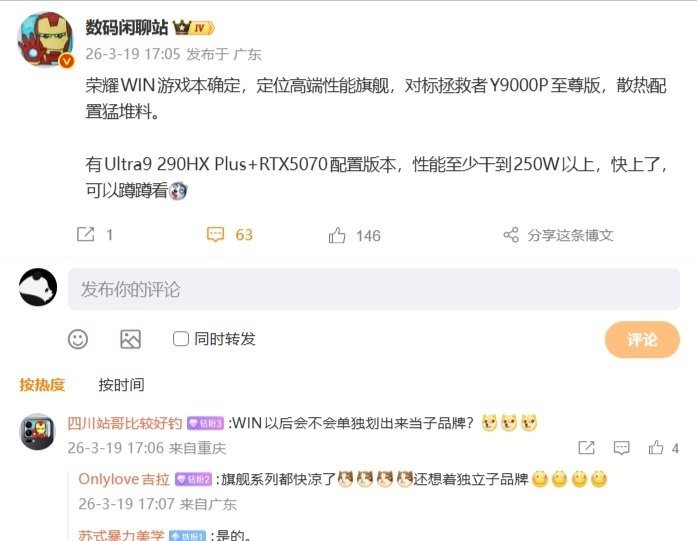 博主透露,荣耀 WIN 游戏本有 Ultra9 290HX Plus + RTX5070 配置版本,性能至少干到 250W 以上。关于这款新游戏本何时上市?他表示:“快上了。”