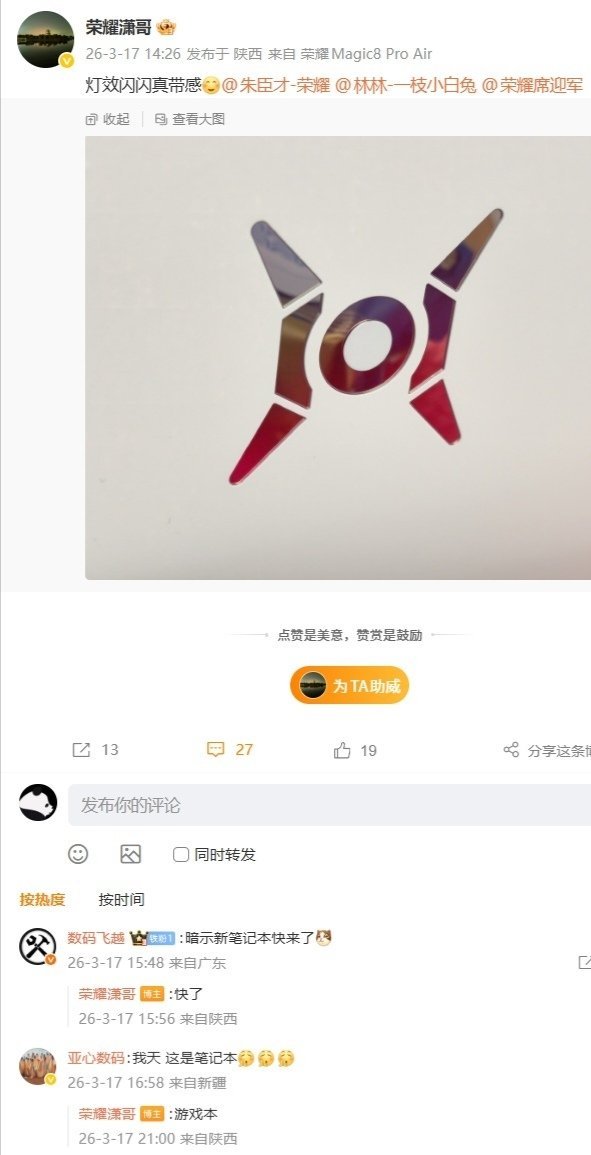 目前可以确定的是,荣耀新款游戏本即将上市,将拥有可发光的猎人 LOGO 设计。