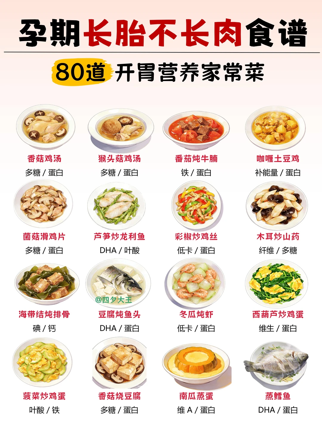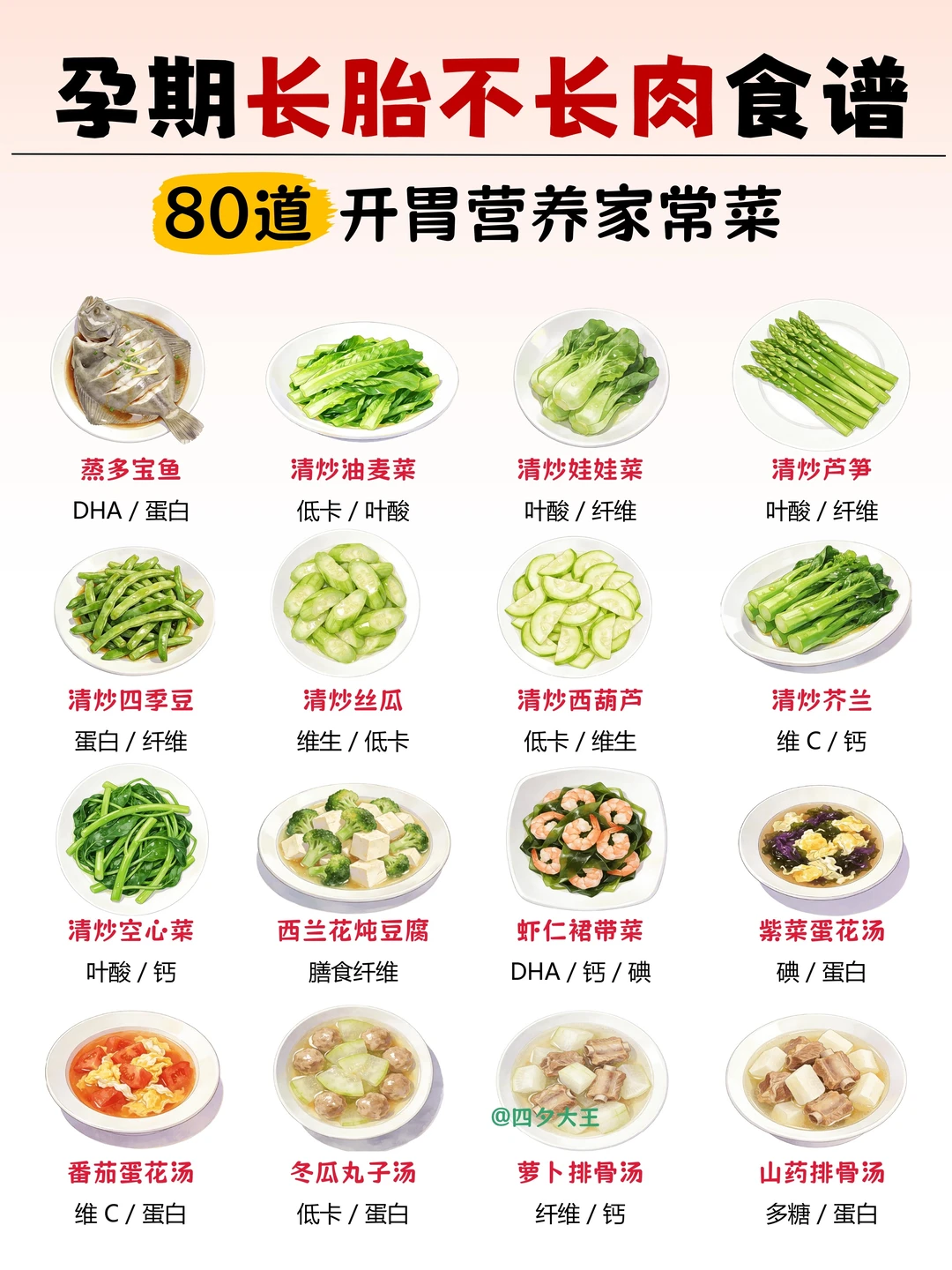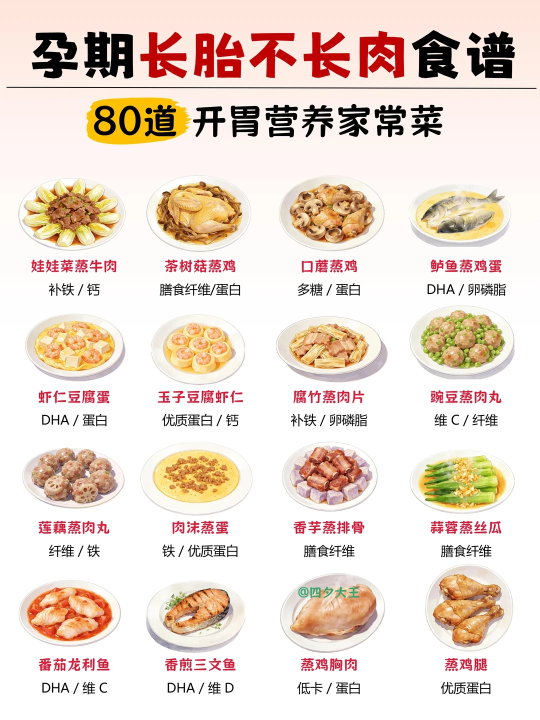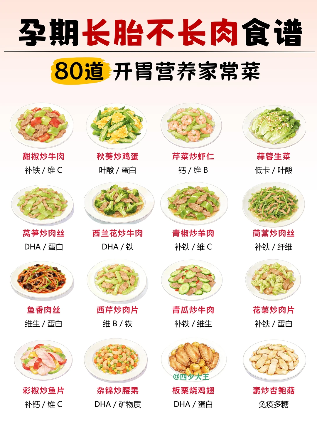 . 孕期吃对 = 长胎不长肉 我给姐妹们整理了80道 家常营养菜谱,超下饭的[赞R] . 另外,孕期饮食抓住这 7 点,产检次次绿灯[黄金薯R] 1️⃣ 主食粗细搭:粗粮占 1/4,总量 250-400g 2️⃣ 蔬菜吃够量:300-500g / 天,深色菜占一半 3️⃣ 奶豆天天有:300ml 奶 + 30-50g 豆制品,补钙补蛋白 4️⃣ 蛋白要优质:鱼虾🐟+ 禽肉🥩 + 鸡蛋🥚,每天换着吃 5️⃣ 清淡少盐:油≤30g、盐≤6g,拒绝重口💢 6️⃣ 零食选健康:坚果、水果、全麦饼,避开高糖 7️⃣ 喝水要足量:1.5-2L / 天,分多次喝 最后,图片上面的菜谱照着做就行 再也不用纠结 “今天吃什么”~