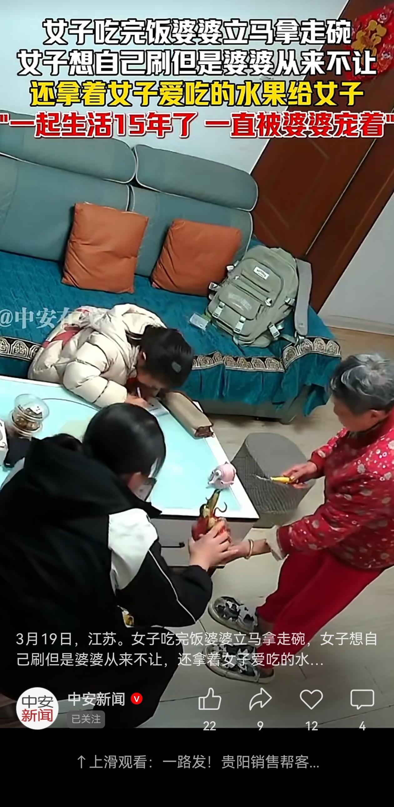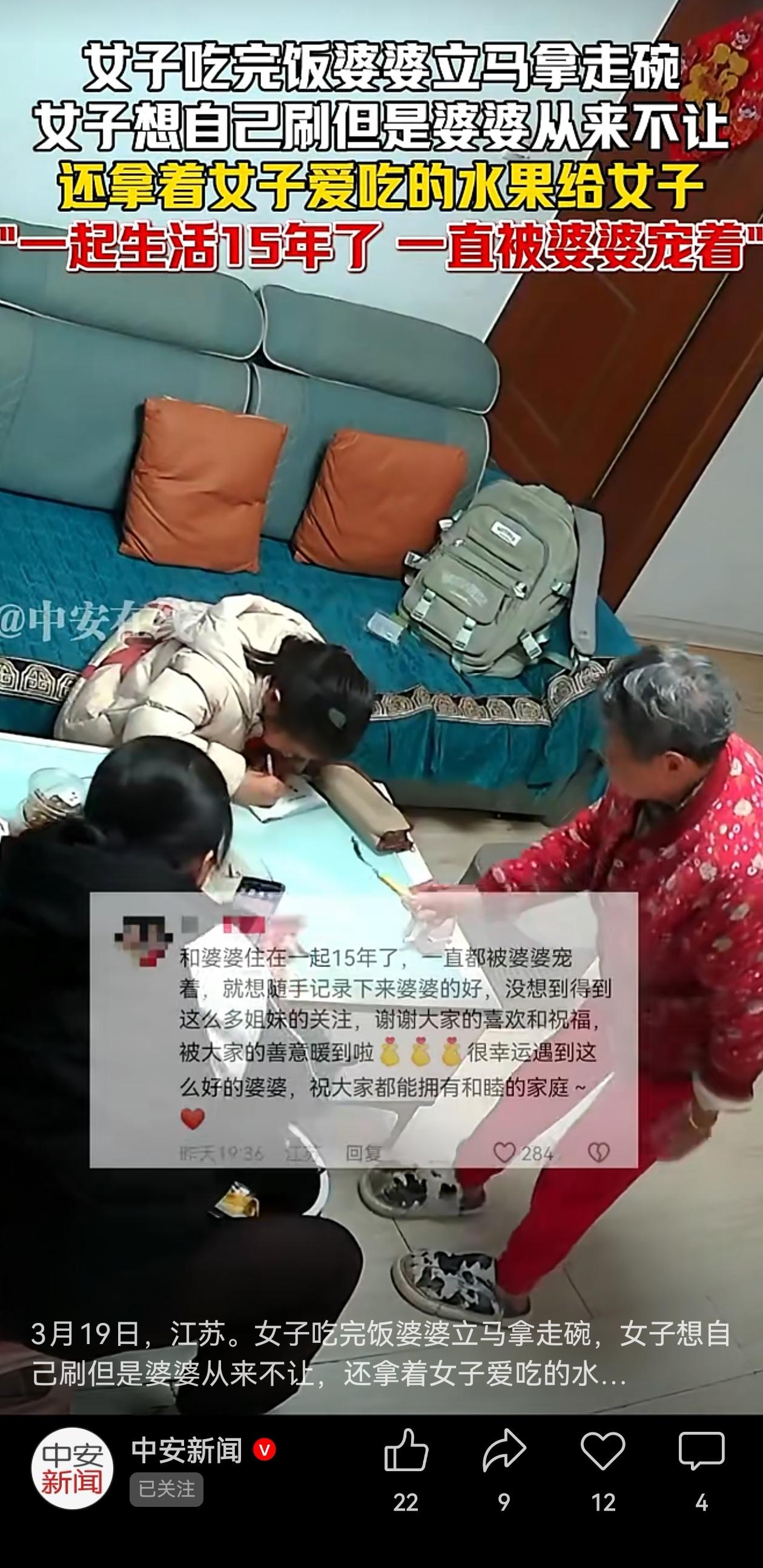 上辈子修来的福气? 江苏的一个儿媳妇,被自己的婆婆15年如一日地宠着。不是偶尔客气的半个月,而是五千多个日夜里的“刚吃完饭就收碗”,还把想吃的水果给拿到跟前。 这些细节一天两天可能装得出来,但是坚持15年,哪能是假的?最难得的是,婆婆的“宠”是“你主动想洗我偏不让”的那种自然,就像疼自己闺女一样理所当然。 说白了,这视频能火,是因为它给那些在婆媳关系里耗得精疲力竭的人,做了个美好的示范,好的关系真的存在。 婆媳住在一个屋檐下,能不鸡飞狗跳、不耗尽力气,靠的不是谁更厉害、谁更能干,而是两个人都愿意把对方往心里放。 视频里这个媳妇,婆婆收碗她没当甩手掌柜,想自己洗;婆婆端水果她记着,还拍下来感慨“被宠了15年”,婆婆的善意对待她接住了。 不是嘴上说说就算,而是心里真觉得这是份情,不理所当然。 所以哪有什么上辈子修来的福气,不过是这辈子遇见了一个真心把你当闺女疼的婆婆,而你也恰好懂得这份好、接住了这份好。 一个愿给,一个愿接,婆媳和睦相处,可不就成了件简单的事? 真心换真心,不才是一家人本该有的样子吗? 信息来源:中安新闻