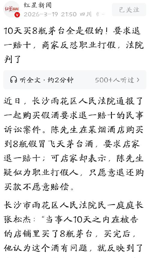 湖南长沙,男子10天内购买8瓶飞天茅台,买完后他觉得酒有问题,直接告到市监局,鉴定之后果然全部为假酒。证据确凿后,男子向商家提出退一赔十,商家一脸委屈,酒是上游供货商供的,他们也不知道这是假酒。更何况,商家怀疑男子买这么多酒,还都没有拆开,他这是职业打假人,因此拒不赔偿。闹上法庭后,法院的判决完全出乎意料。 前阵子出了个挺有意思的事,有个陈大哥,在10天之内,分好几次在同一家烟酒店买了8瓶飞天茅台。 买回去之后他越看越觉得不对劲,心想这不会是假酒吧?于是他也没去找老板闹,直接就把这8瓶酒全抱到市监局去了。 市监局也没含糊,立马请了贵州茅台厂家的专家来鉴定,结果一出来,好家伙,这8瓶酒全是假的!包装、防伪、做工,没一样跟正品沾边的,妥妥的假冒伪劣产品。 陈大哥拿到鉴定报告,心里就有底了,他找到那家烟酒店,要求很简单:把买酒的钱全退了,还得按法律规定,退一赔十。 这老板一听,脑袋都大了,他是一脸委屈,说这酒也是从上游正规渠道进的,自己卖酒这么多年也看不出真假啊,真不是故意坑人。 而且老板反过一想,觉得不对劲:你陈大哥10天买了8瓶茅台,买回去也不喝,包装都不拆,直接就去举报,这不是明摆着来搞事的吗?这哪是普通消费者啊,这就是职业打假人来讹钱的!所以,这十倍赔偿,老板是坚决不给。 双方谈不拢,陈大哥一纸诉状把烟酒店告到了法院,庭审的时候,那是公说公有理,婆说婆有理,老板一口咬定自己不知情,是被供货商坑了,还指责陈大哥是恶意买假索赔。 陈大哥则坚持说,不管我买多少,你卖假酒是事实,法律规定的退一赔十,你就得认。 大家都等着看法院怎么判,是全赔呢,还是只退款不赔钱?结果法院的判决出来,让很多人都没想到,这法官水平是真高,端的一碗水特别平。 判决结果是这样的:第一,这8瓶假酒的钱,老板得一分不少全退给陈大哥,第二,关于十倍赔偿这块,法院只支持其中2瓶按十倍赔偿,剩下那6瓶,就不支持十倍赔了。 法院这理由说得让人心服口服,首先,你卖假酒这是铁板钉钉的事实,不管你是真不知道还是装不知道,都违反了食品安全法,退货退款这是必须的。 但飞天茅台这东西属于高档消费品,咱们普通人家谁没事10天买8瓶还不喝啊?陈大哥这行为明显超出了正常的消费需求,带有很强的索赔目的。 所以法院认定,其中2瓶算是合理的生活消费,这部分支持十倍赔偿,既惩罚了卖假酒的行为,又不纵容那种靠打假发横财的风气。 这个判决一出来,网友们都竖大拇指,觉得特别公道,一方面,卖假酒的商家挨了罚,长了记性,另一方面,也没让职业打假人钻空子赚大钱。 对陈大哥来说,虽然没拿到80倍的赔偿,但本金拿回来了,还赚了2瓶的十倍赔偿,也算没白折腾。 这事也给咱们都提了个醒,咱们当消费者的,买到假货维权那是天经地义,但也别动歪心思,想着靠买假货发家致富。 做生意的呢,进货可得把眼睛擦亮了,一定要查验清楚来源,留好凭证,别到时候出了事,一句“我不知道”就想甩锅,那法律可是不认账的。 食品安全这事可没小事,假酒喝坏了身体谁负责?不管是买的还是卖的,心里都得有杆秤,守住底线才是正道。 这起案子最后这么判,既打击了假货,又规范了维权,让大家明白:法律保护的是正当维权,可不是让你用来当生财工具的。 对此你怎么看? 信源:红星新闻