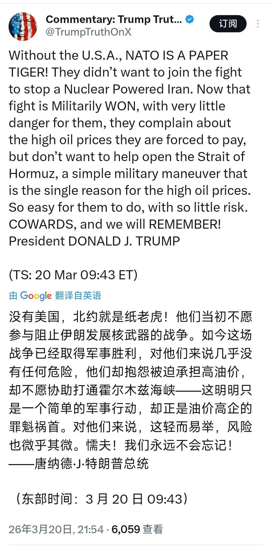 特朗普今晚(北京时间3月20日晚)发文写道:“没有美国,北约就是纸老虎!他们当初不愿参与阻止伊朗发展核武器的战争。如今这场战争已经取得军事胜利,对他们来说几乎没有任何危险,他们却抱怨被迫承担高油价,却不愿协助打通霍尔木兹海峡这明明只是一个简单的军事行动,却正是油价高企的罪魁祸首。对他们来说,这轻而易举,风险也微乎其微。懦夫!我们永远不会忘记!” [机智]评几句:特朗普的发文满是逻辑混乱的荒唐与道貌岸然的虚伪,堪称霸权甩锅的拙劣表演。一边吹嘘对伊战事已取得军事胜利,俨然赢麻了的姿态,一边却气急败坏指责北约盟友不愿助阵打通霍尔木兹海峡,既然胜局已定、风险全无,又何须这些战后才加入的盟友凑数?说到底不过是美国亲手点燃中东战火,深陷霍尔木兹海峡护航的实力窘境,想拉盟友来擦屁股收拾烂摊子,却偏要装出颐指气使的模样,将自身酿的高油价苦果甩锅他人,动辄骂盟友懦夫,实则暴露了自己无力收场的窘迫,这种既要当霸主又不想担责的做派,不过是美国霸权日渐衰落的丑陋写照。