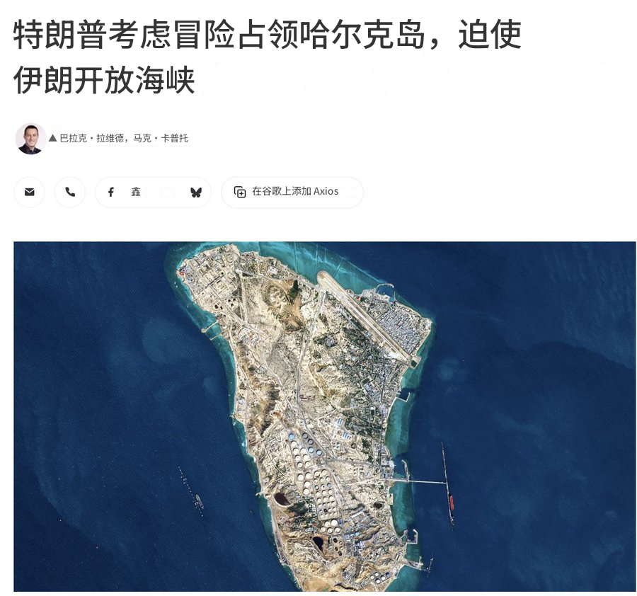 美媒Axios:特朗普考虑冒险占领哈尔克岛,迫使伊朗开放霍尔木兹海峡。美伊以冲突