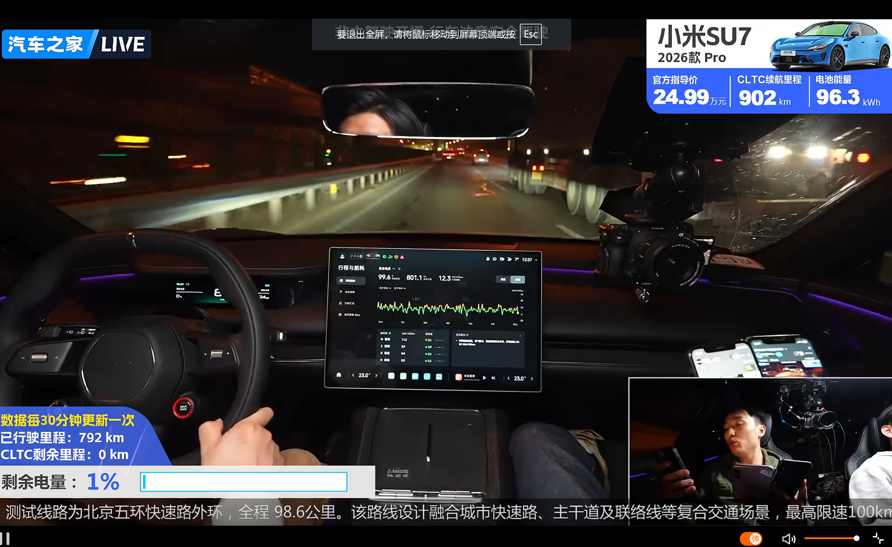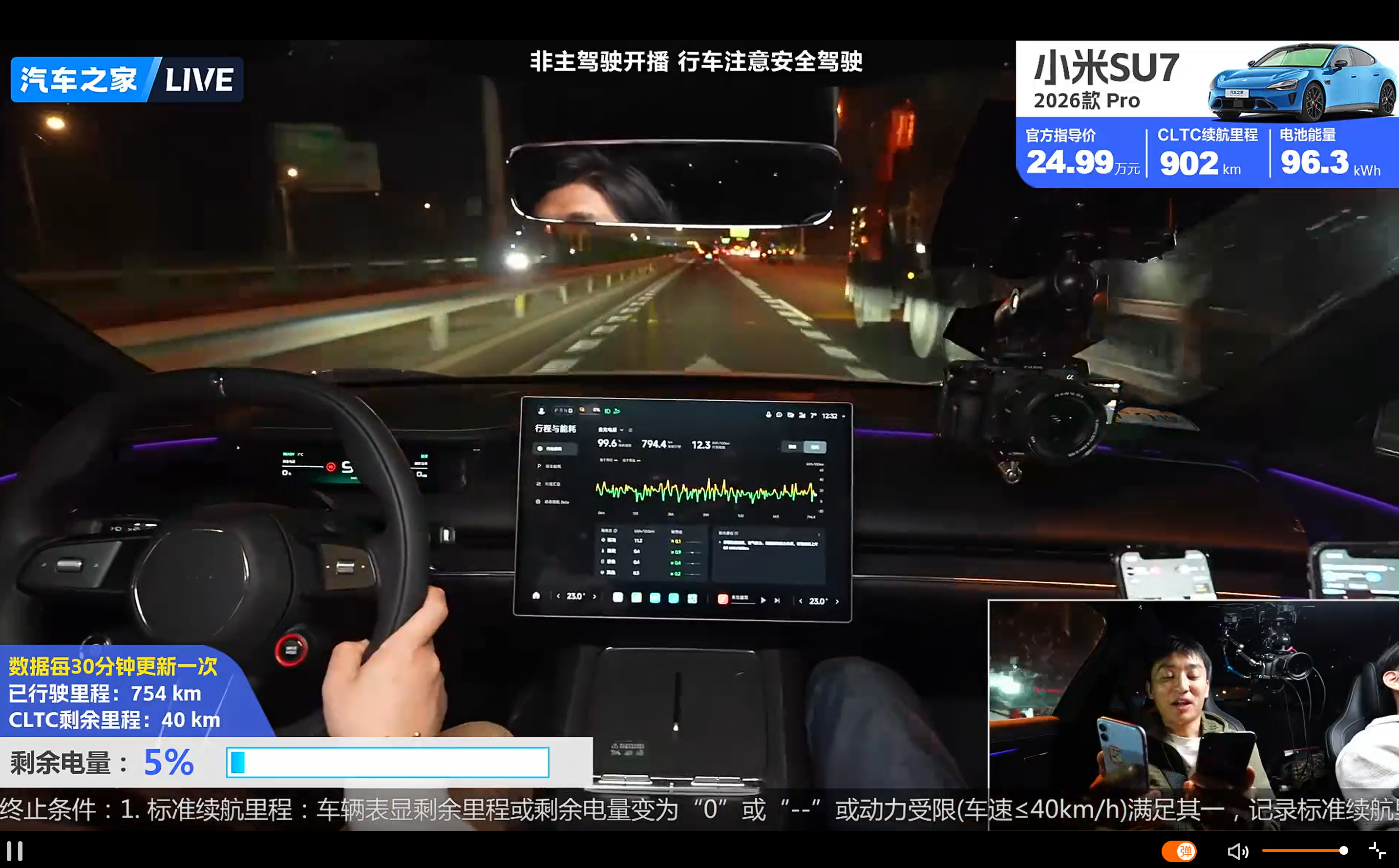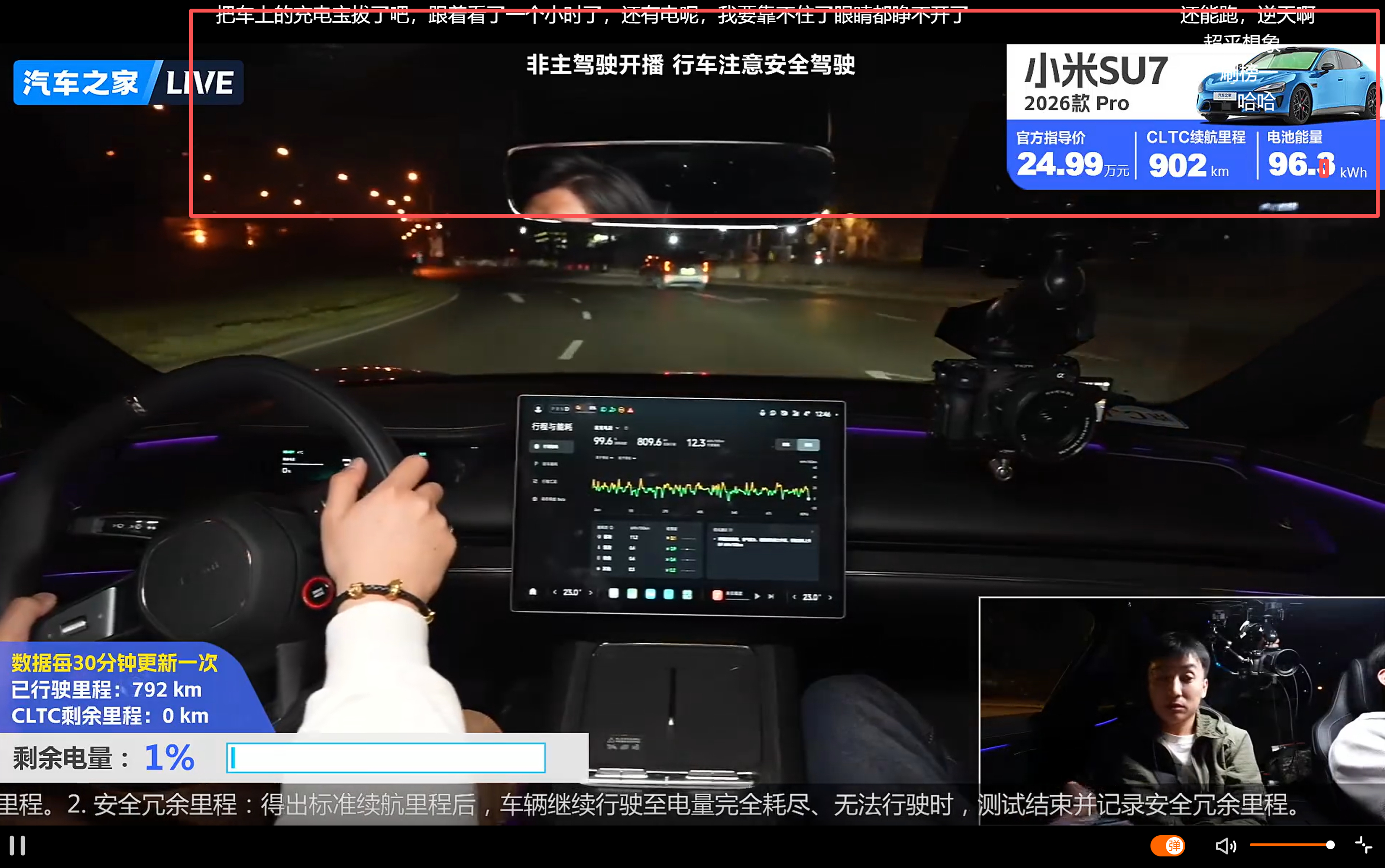 刚才在高速上即便是0%的电量还可以跑80以上的速度,没有限速,很猛。现在已经下高速了,开始绕圈了,估计跑个820公里都是妥妥的,搞不好跑830公里哈哈,看看小米SU7藏电藏多少。而且车上是坐着3个成年人,加上设备,相机什么的,载重起码500斤以上。真猛啊,现在这个气温开小米SU7跑长途,1000公里只充一次电是很容易达成的。