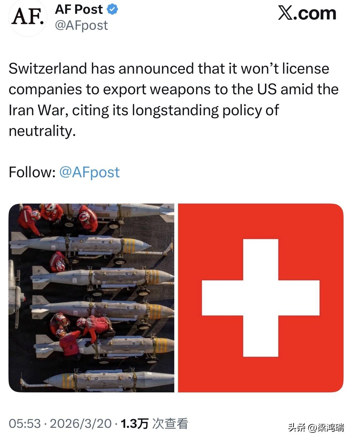 瑞士宣布,鉴于其长期以来奉行的中立政策,在伊朗战争期间,瑞士不会向美国发放武器出