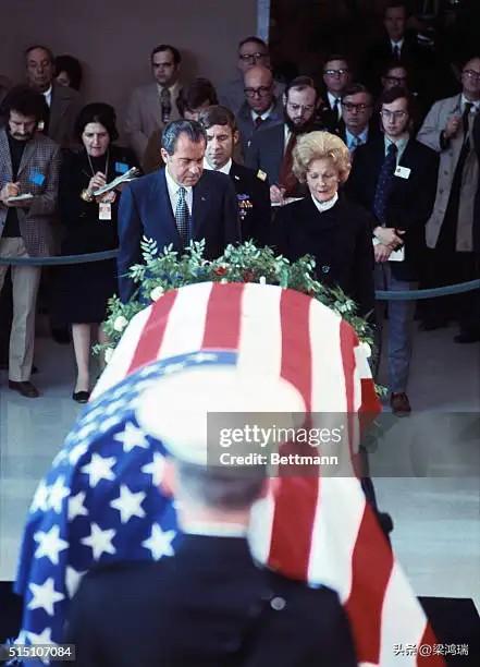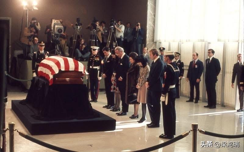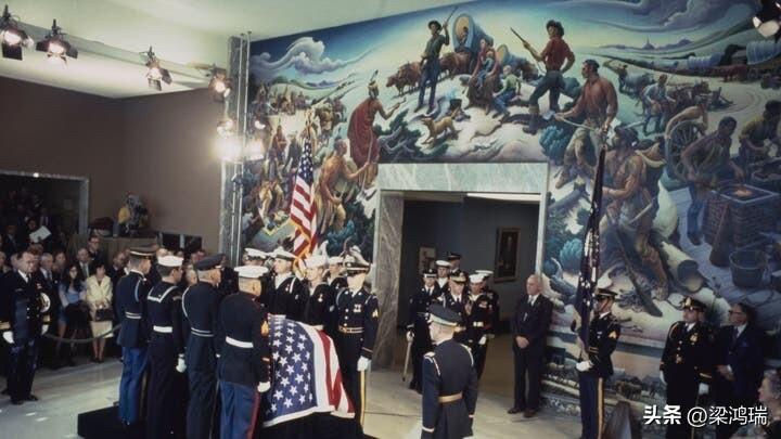 哈里·杜鲁门原本规划了一场隆重的葬礼,但最终取消了这一安排,转而举行了一场规模较小的仪式:1972 年 12 月 28 日,第 33 任美国总统哈里·S·杜鲁门(Harry S. Truman)的灵柩在密苏里州独立城的杜鲁门总统图书馆暨博物馆内供人瞻仰(lying in state)。 画面中覆盖着美国国旗的灵柩内安放着杜鲁门总统的遗体。他于 1972 年 12 月 26 日因肺炎去世,享年 88 岁。 杜鲁门图书馆的大厅,背景是著名画家托马斯·哈特·本顿(Thomas Hart Benton)创作的巨幅壁画,题为《独立城与西部的开发》(Independence and the Opening of the West)。 出席嘉宾: 尽管杜鲁门生前曾计划过复杂的国葬,但最终遵循其意愿举行了规模较小的葬礼。出席此次吊唁仪式的包括当时的总统理查德·尼克松及夫人,以及前总统林登·约翰逊等近 30,000 名民众。 礼仪: 灵柩由各军种组成的仪仗队守护。 图中所示便是他在图书馆举行的遗体瞻仰仪式,约翰逊总统与尼克松总统均出席了现场。