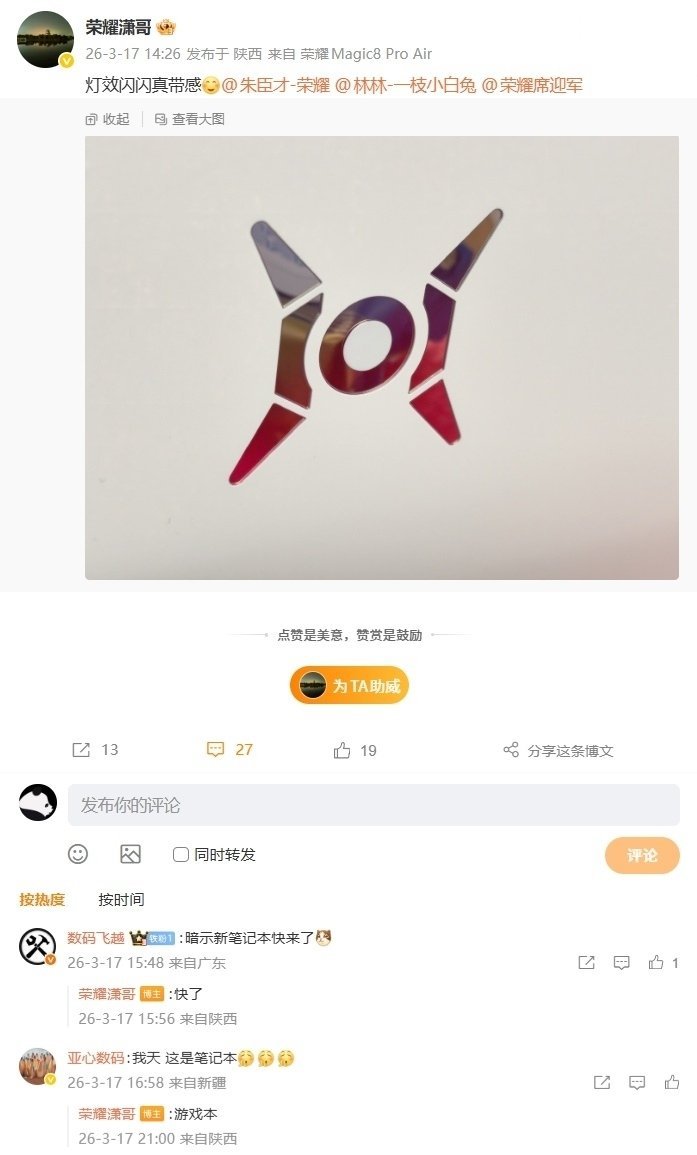【荣耀新款游戏本将至:有望归属 WIN 系列,猎人发光 LOGO 设计公布】荣耀全场景产品线工作人员 潇哥 分享了新款游戏本的猎人发光 LOGO 造型,并预告这款新笔记本快来了。