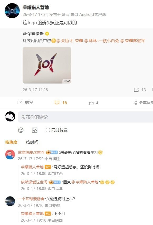 值得一提的是,此次展示的发光 LOGO 与荣耀猎人笔记本的 LOGO 相似。在 2024 年 3 月 18 日的荣耀春季旗舰新品发布会上,MagicBook Pro 16 笔记本正式发布,官方还宣布荣耀猎人游戏本正式回归。