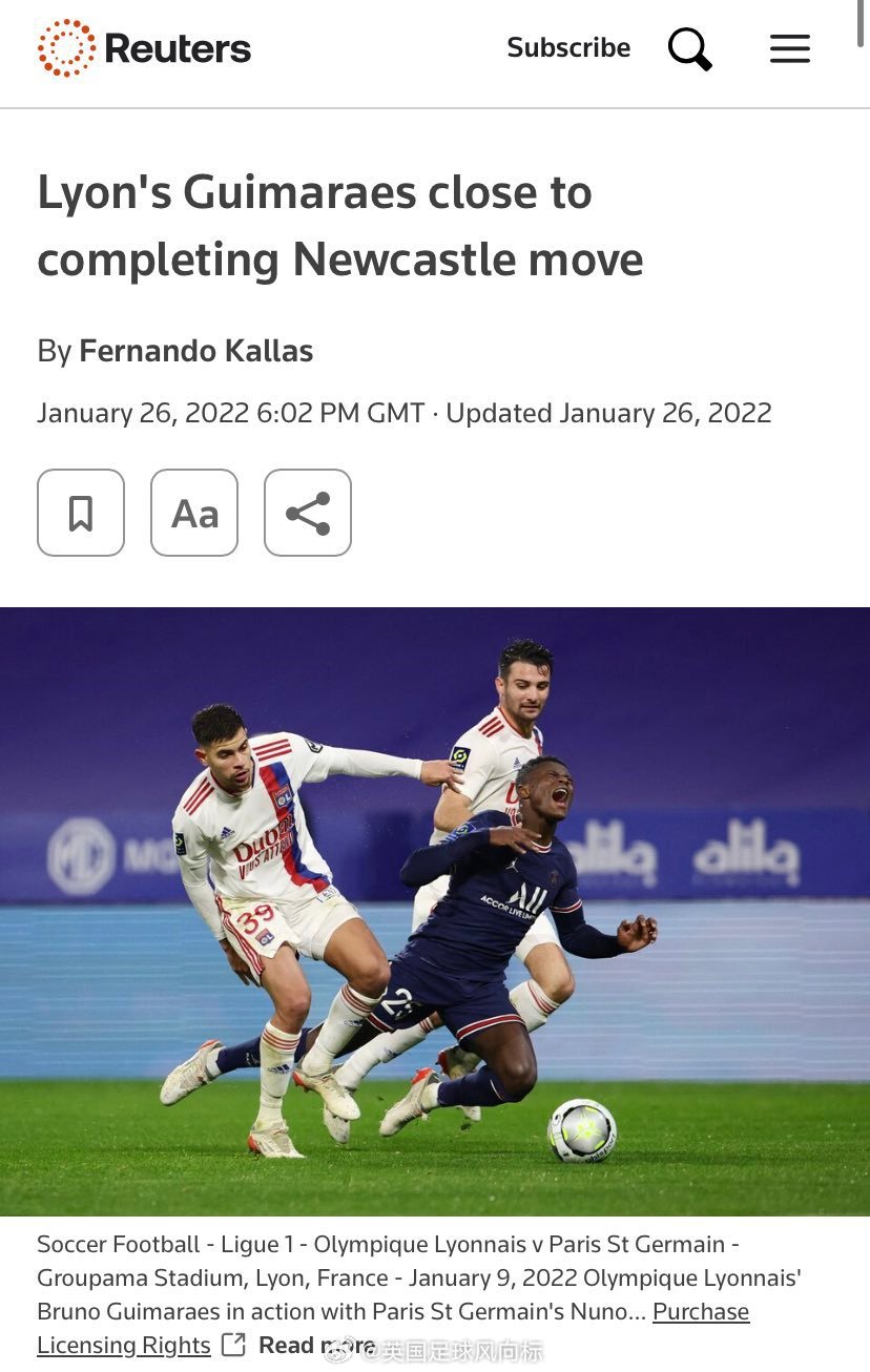 值提一起的是,2022年1月29日,纽卡斯尔以4000万英镑的价格,从里昂引进吉马良斯,当时最先爆料这桩交易,正是这位《路透社》的巴西记者,他在2022年1月26日就已经透露交易即将完成,他应该有来自球员方的消息源。